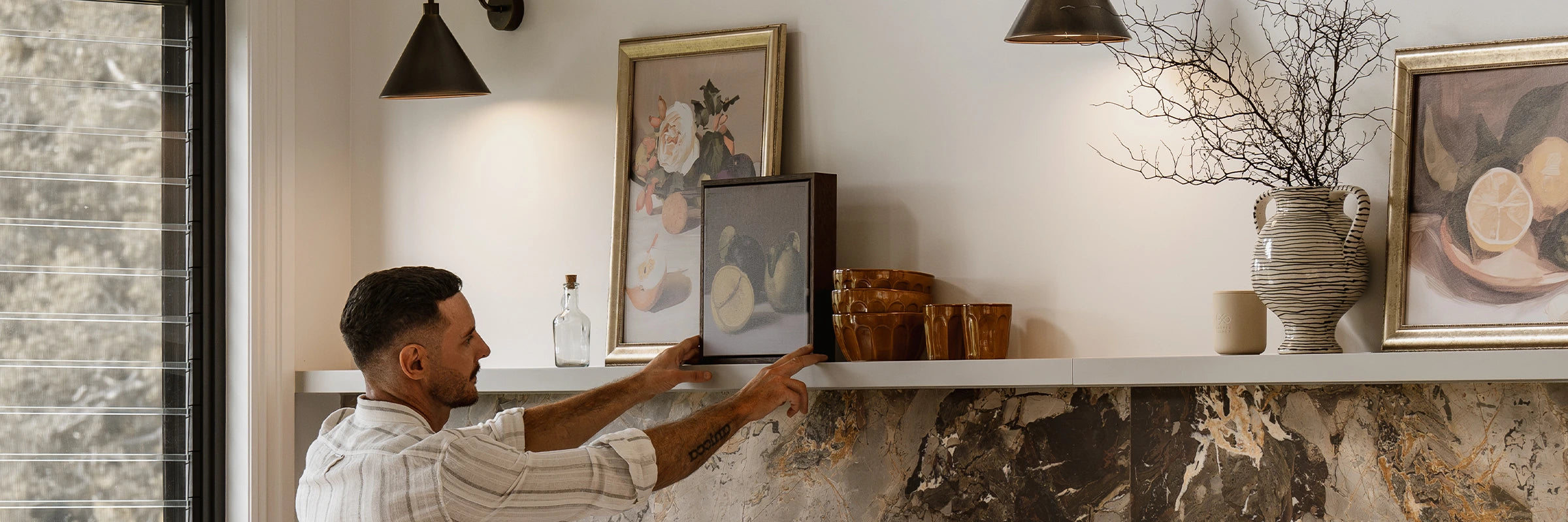 Try curating two or three pieces of wall art for men in complementary colours or themes. This works especially well in smaller areas like hallways or reading corners, turning a blank wall into something with intention. It feels curated without trying too hard, which is exactly his style.