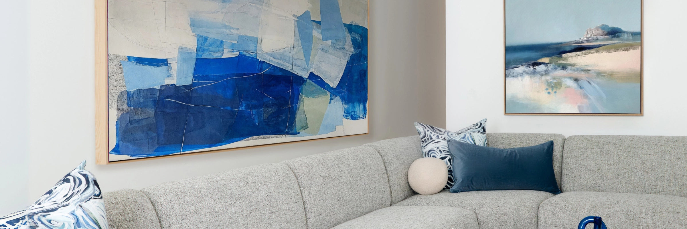 Coastal doesn’t need to rely on only pale blues and soft whites. Masculine art in muted navy, sandy neutrals or earthy tones adds balance and depth to breezy spaces. A moody seascape or minimalist abstract in a whitewashed or light timber frame feels fresh while keeping the room grounded.