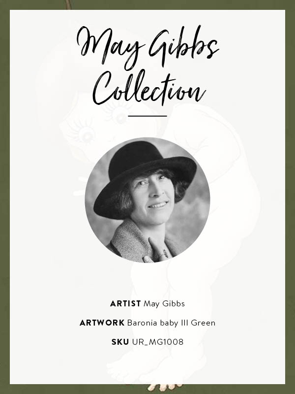 Boronia Baby III Green Unframed Art Print - Add a touch of adorable charm to your space with this artwork from the Urban Road X May Gibbs Artwork Collection. Caught mid-tumble or perhaps in a moment of curious wonder, this Boronia Baby’s expressive pose radiates whimsy and innocence.