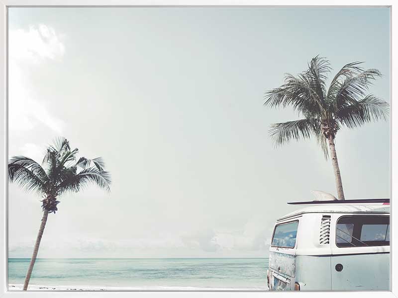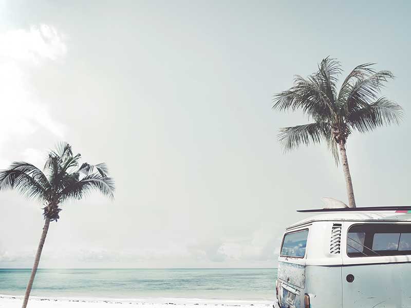 Good Vibrations - A laid-back photographic image featuring a light blue kombi van at the beach.