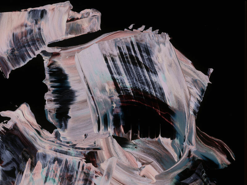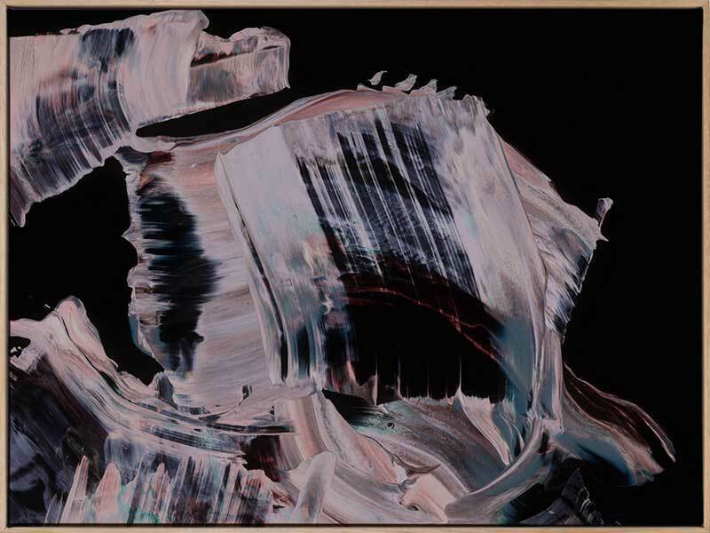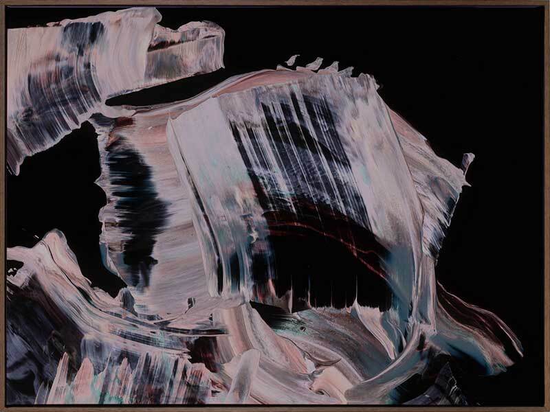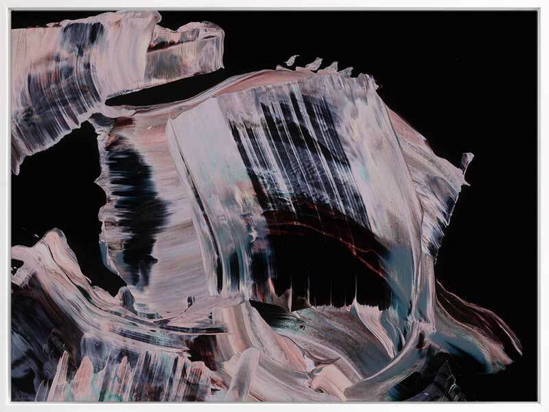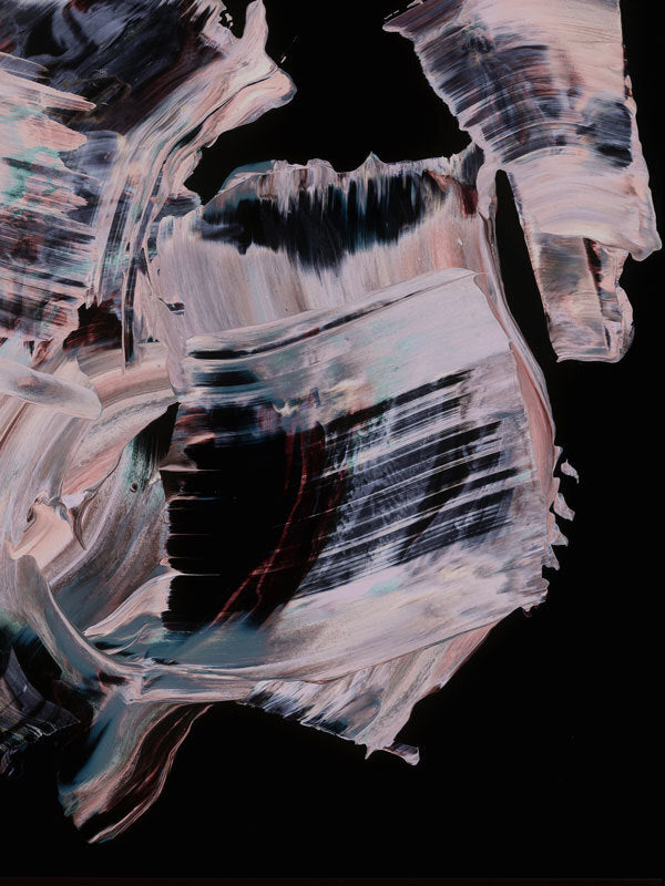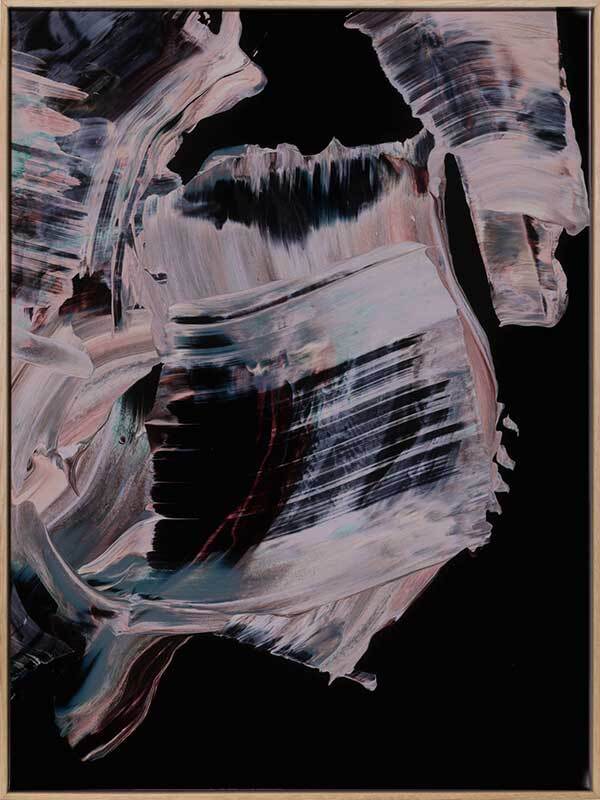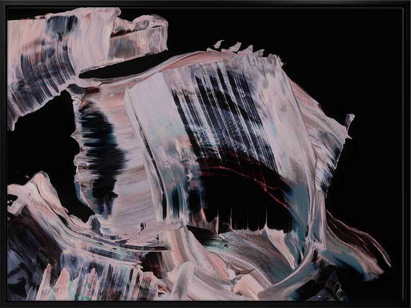Tamburlaine II Canvas Art Print: A dark, moody abstract artwork featuring broad, blush and purple squeegee strokes with flecks of smoky grey, green and burgundy, on a black background. Pairs with Tamburlaine I. 2019 AUTUMN/WINTER COLLECTION: ODYSSEY