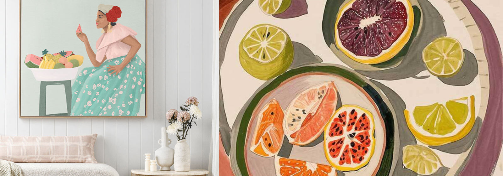 Practical example using fruit still lifes: Combine Platano II Pink and Bowl of Pears as a paired set. The soft pinks and peachy tones feel fresh and appetizing.