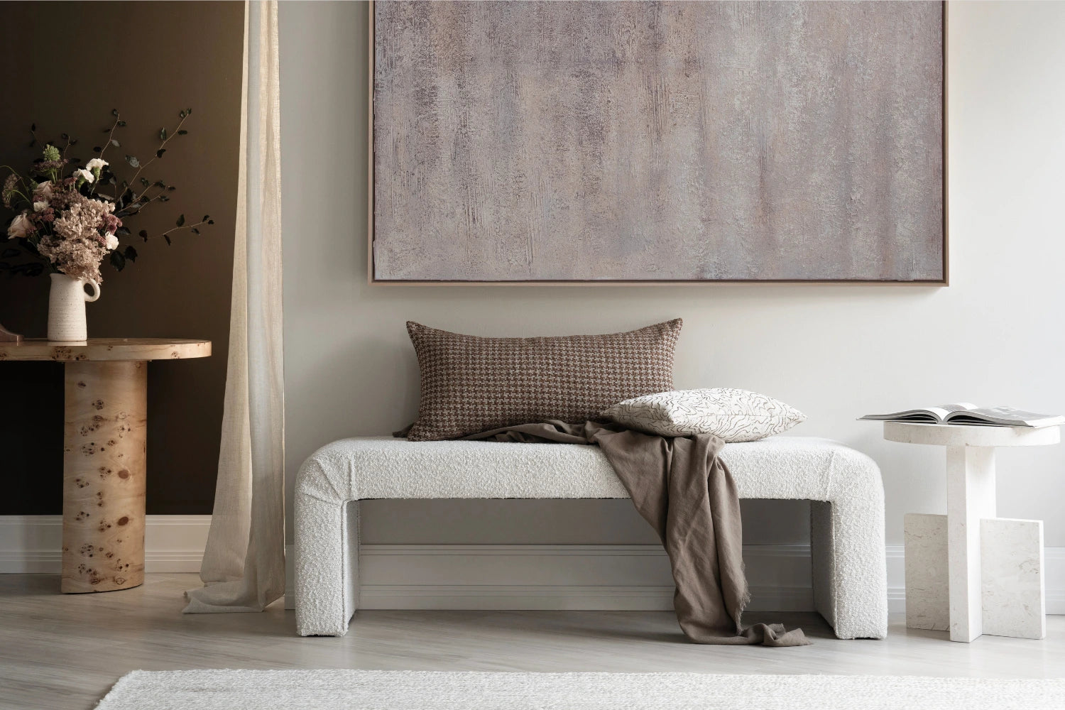 In the Bedroom: These artworks bring a softness, their tactile quality and muted tones creating a restful retreat, where calm and cool collide.