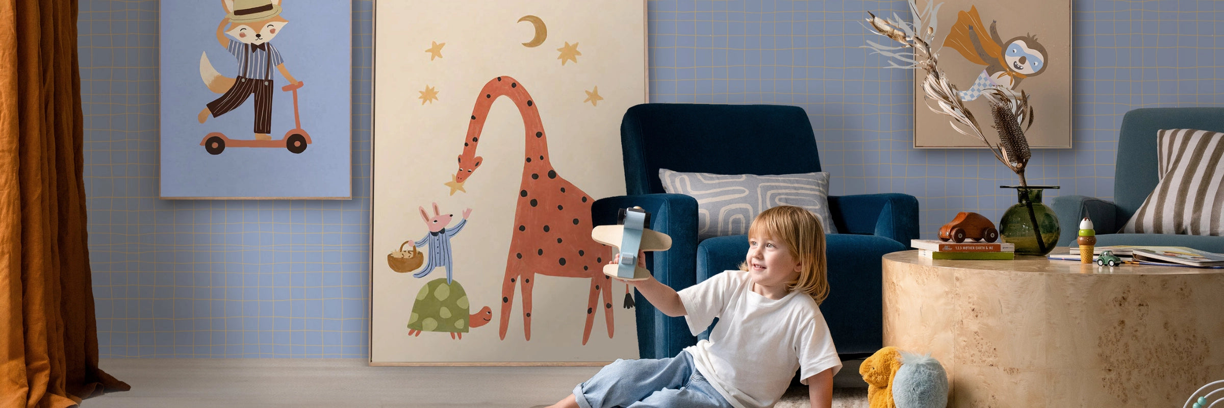 Every room benefits from a hero piece that immediately draws the eye. A large children’s wall art print above the cot, bed, or reading nook naturally anchors the space and gives it a point of balance. Choose artwork in soft palettes or landscape art for kids to set the tone and make the room feel calm, bright, and inviting. When you want to layer in more character, add smaller pieces around the hero to build a relaxed gallery wall that can grow over time.