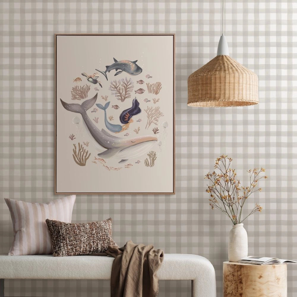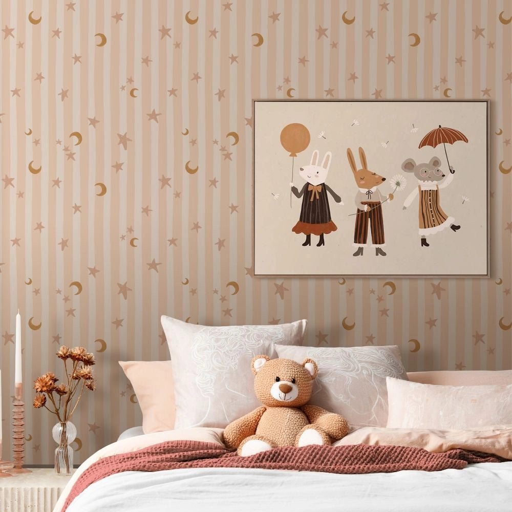 Harmony is key when styling artwork for kids' rooms. Look at the colours and textures already in the space, such as bedding, curtains, or rugs, and choose kids art prints that complement or gently contrast with them. Light linens and natural timber pair beautifully with whimsical designs in soft neutrals, while rooms with patterned textiles or colourful toys feel more balanced with gentle, minimal kids wallpaper. The right pairing keeps the room cohesive rather than cluttered.