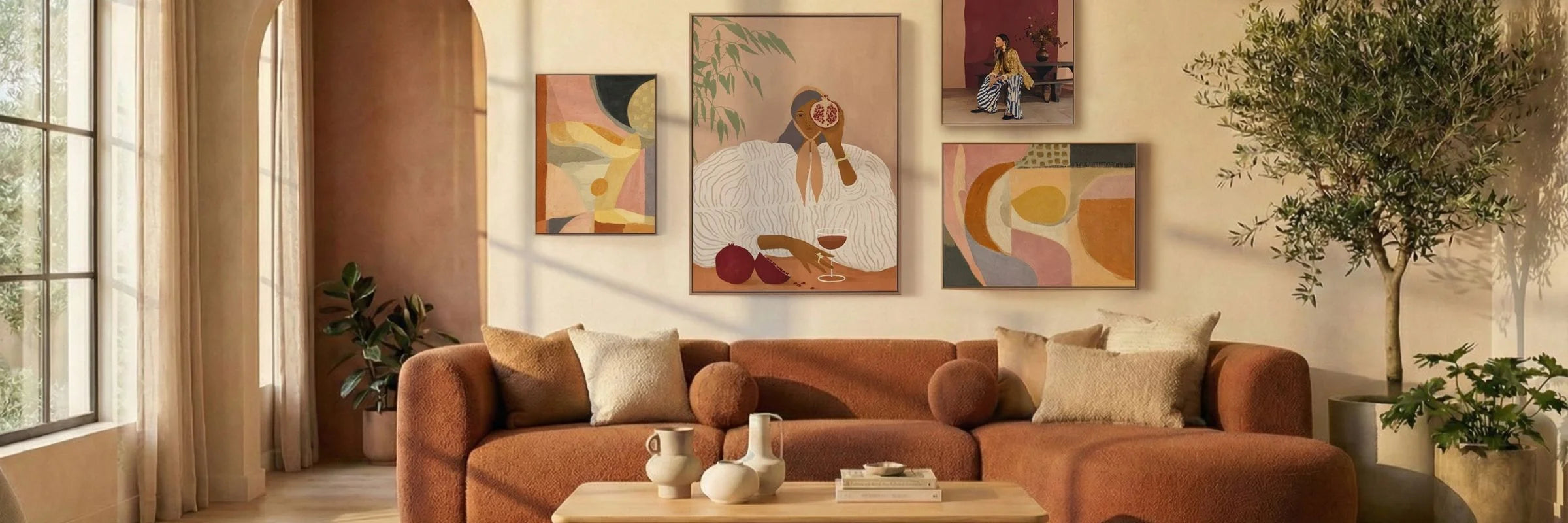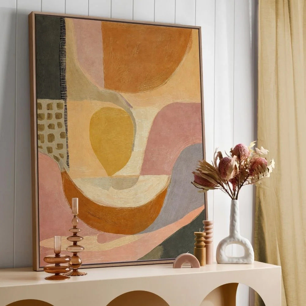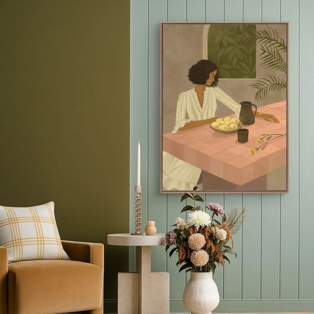 Lounging Ladies wall art pairs best with interiors that feel natural, tactile, and thoughtfully layered. While the collection suits a range of styles, certain materials enhance its softness and depth.