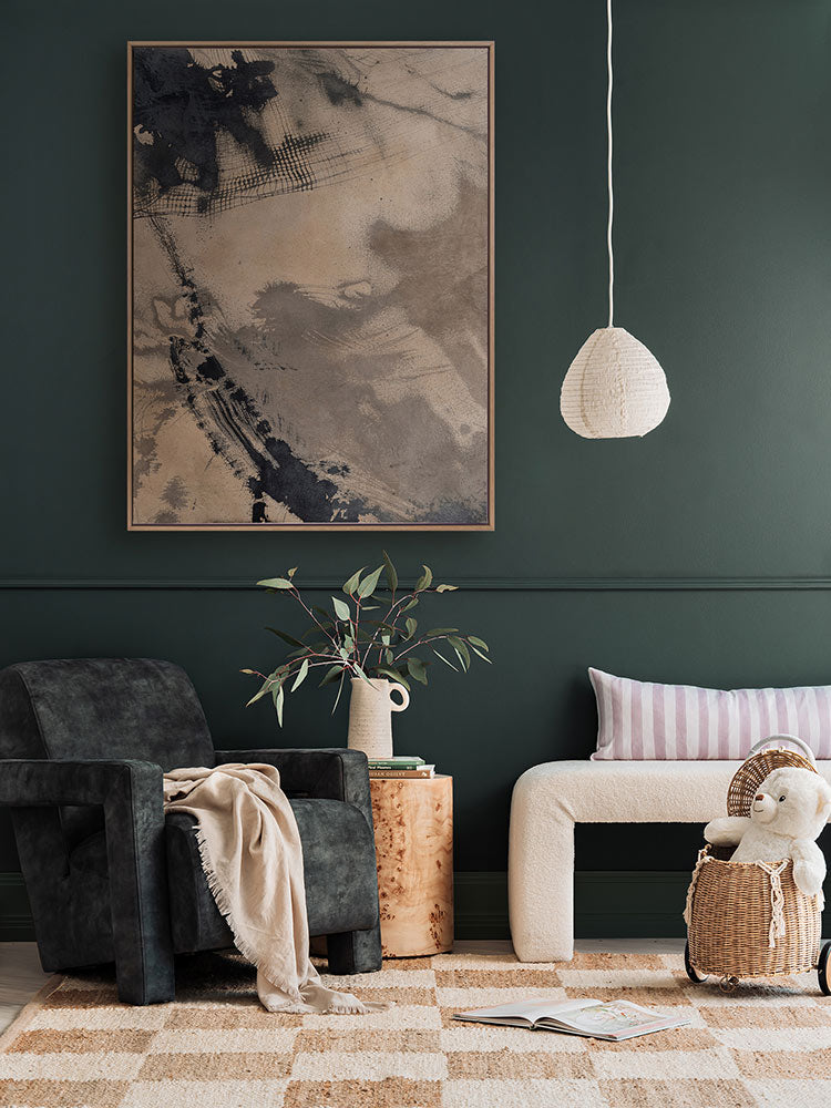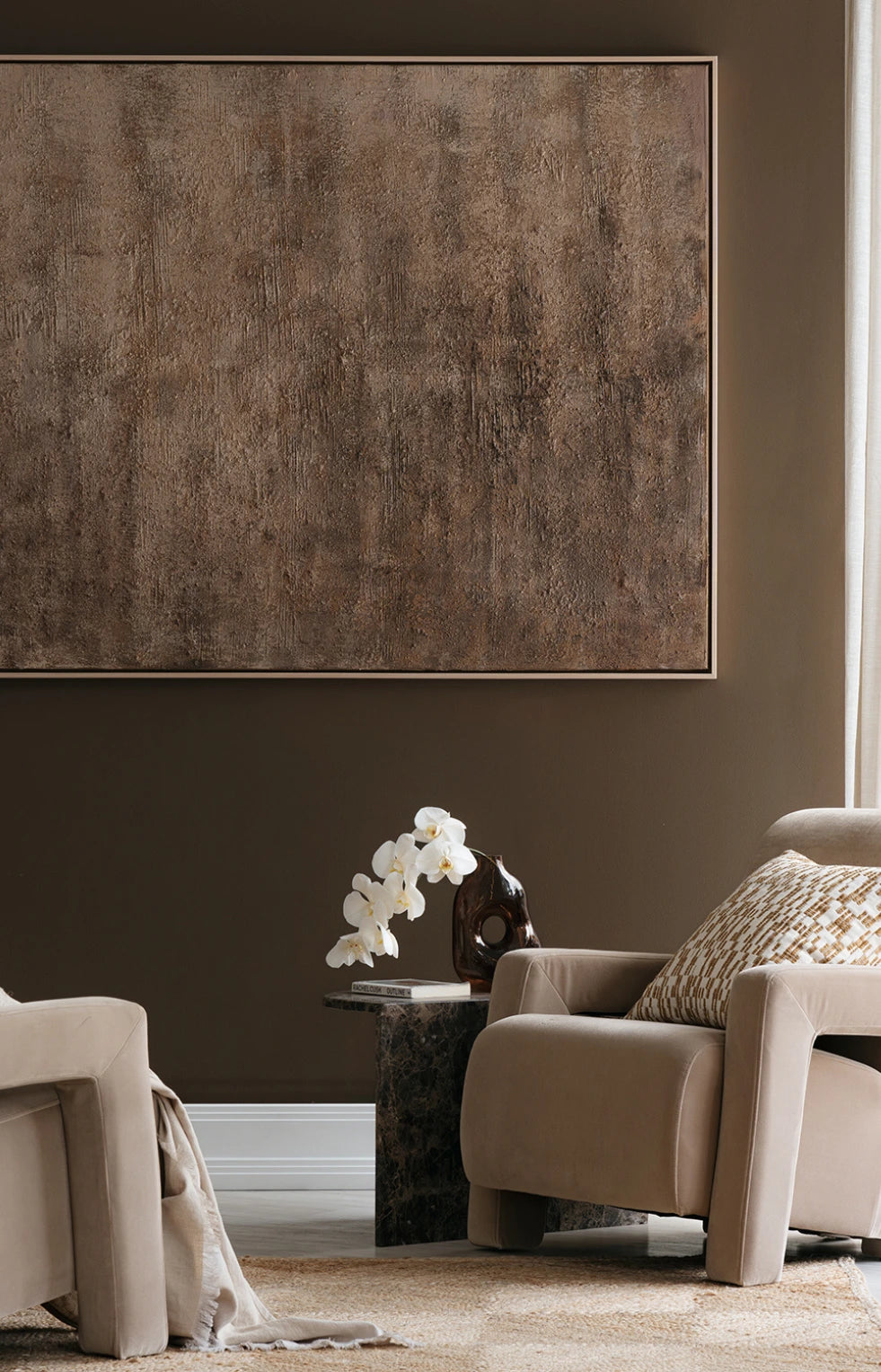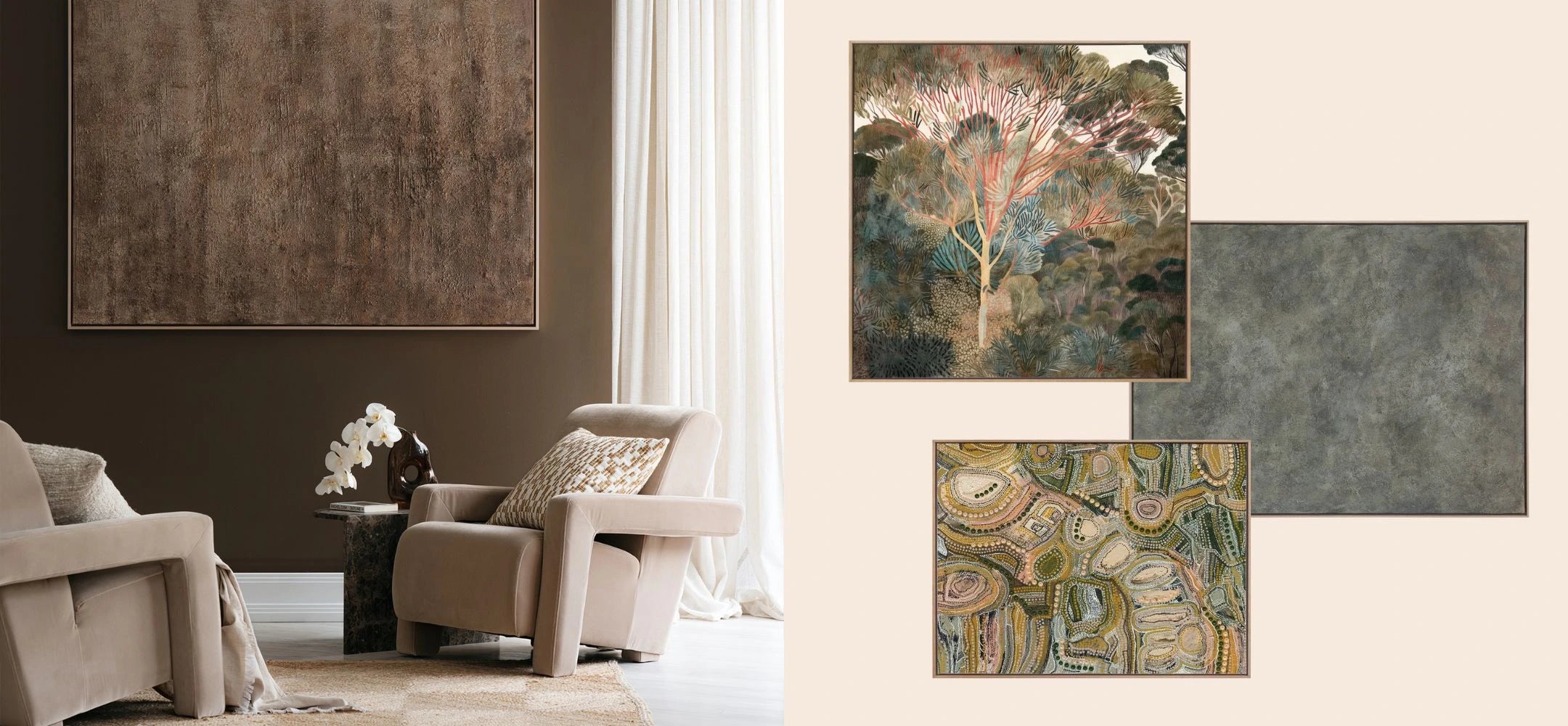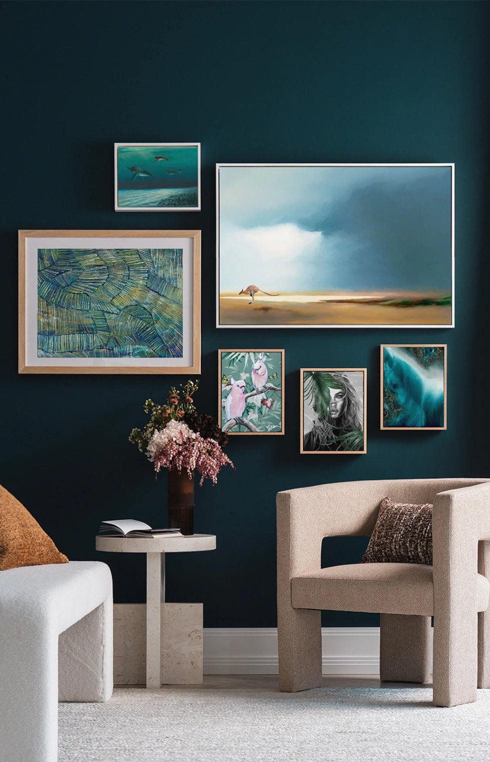 A burnt sienna canvas paired with creamy beige walls exudes warmth and depth, while a moody teal print against a deep charcoal wall creates a luxe, intimate atmosphere. Forget blending in - this year, it’s about standing out.