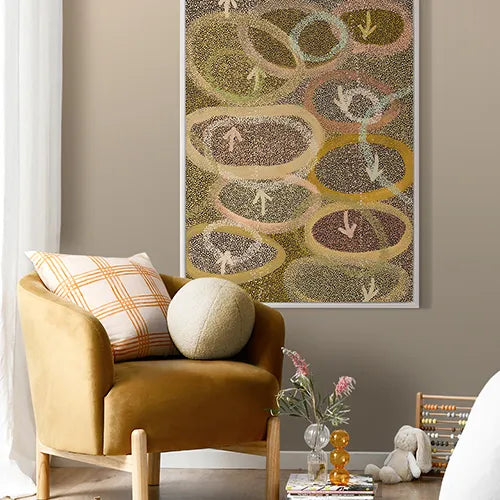 From vibrant yellow Aboriginal art celebrating the golden tones of Australia's sun-drenched landscapes to contemporary pieces perfect for a room with yellow wallpaper or yellow dining room walls, we offer an exceptional range to suit any vision. Create a soft yellow living room that feels sophisticated yet welcoming, or embrace bold yellow oval room designs.