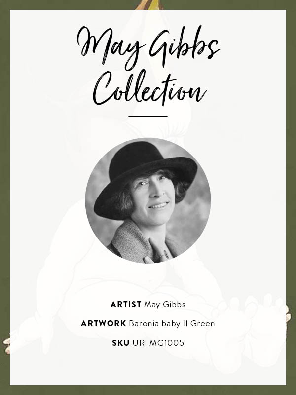 Perfect for nurseries, children’s bedrooms, or spaces yearning for a playful yet refined touch, this artwork brings May Gibbs’ beloved storytelling to life. The Boronia Baby’s sweet, curious expression invites a sense of innocence and whimsy, evoking a connection to Australia’s natural beauty and heritage.