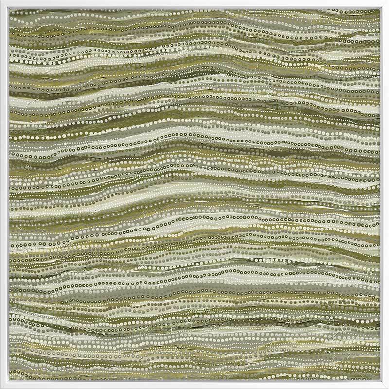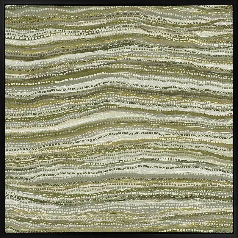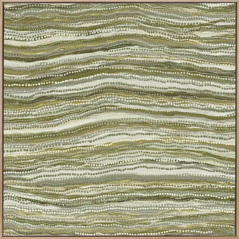 Dhaagun Green Canvas Art Print - This beautiful contemporary piece breathes a sense of rhythm into any room. It focuses on the impact of carefully placed dots in traditional Indigenous Aboriginal works, as they all move in one direction, with a subtle curve in the centre giving it an organic feel. A monochrome palette of seafoam green ranging from light to dark means this is a versatile piece for most interior design styles.