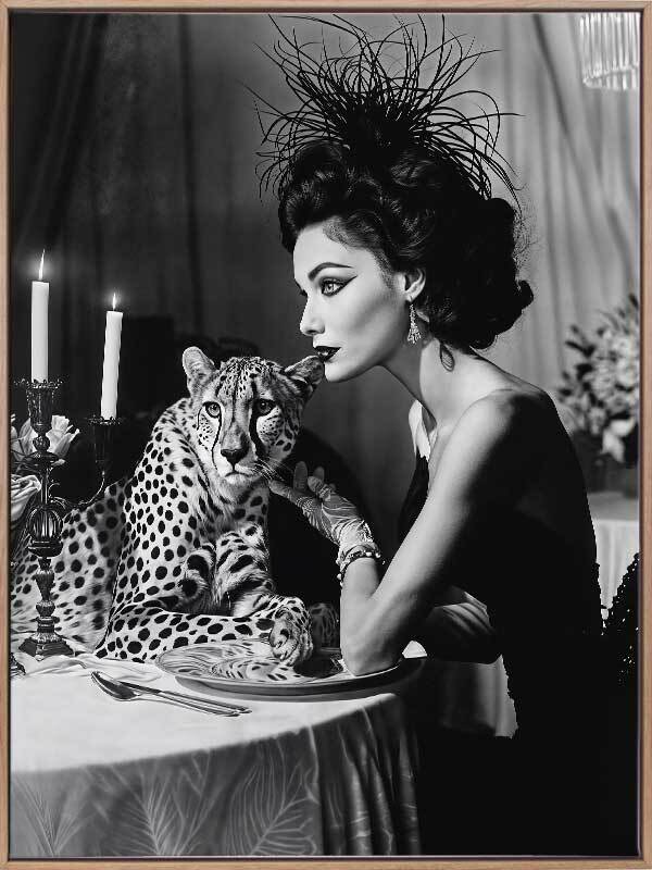 Feline Couture Canvas Art Print - In this captivating black-and-white artwork from interior designer Shaynna Blaze's exclusive designer collection, glamour and intrigue come together in perfect harmony. A woman dressed in a sleek black gown and adorned with a feather hat pets her cheetah dinner companion under the soft candlelight at the dinner table. With a monotone palette, this limited edition art print adds a retro-inspired flair to any space, exuding pure glamour with a cheeky, relaxed edge. This wall art for living rooms and bedrooms channels both elegance and mystery, making it a bold and luxurious addition to any interior design style.