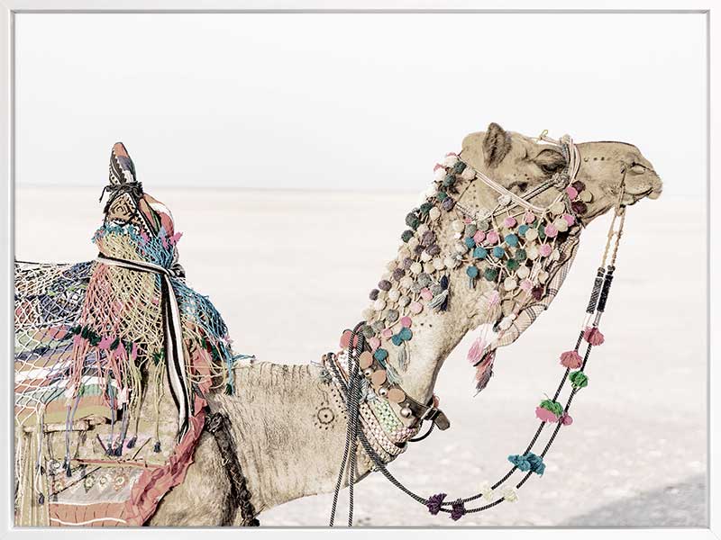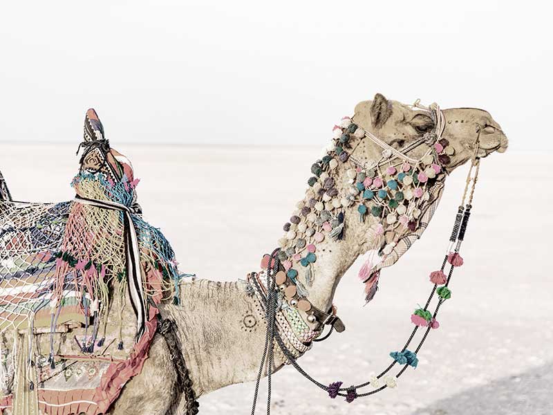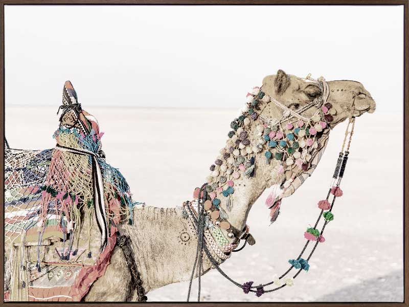 Globe Trotter - A muted photographic image of an Egyptian camel adorned with colourful pom poms and tassels. Photographed by Hari Nandakumar.