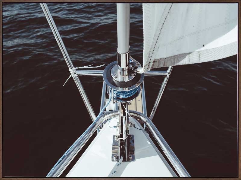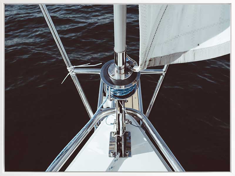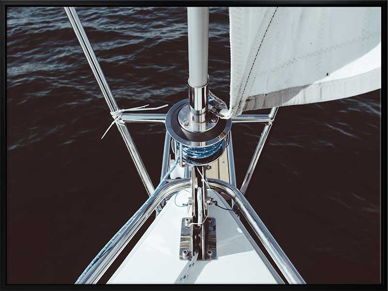 Half Mast - A close up photographic image featuring a boat on dark blue waters.