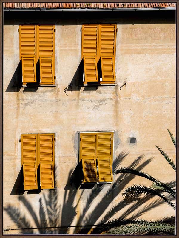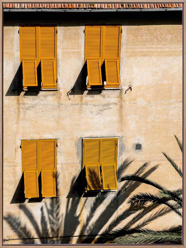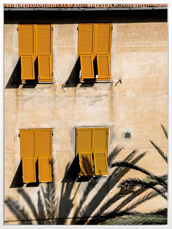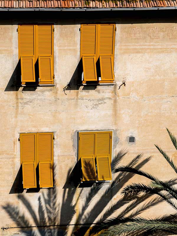 Italian Clay - A close-cropped photograph of an aged European facade featuring bright yellow shutters and a faded yellow wall, shaded by palm fronds. Photographed by Dvon Owens.