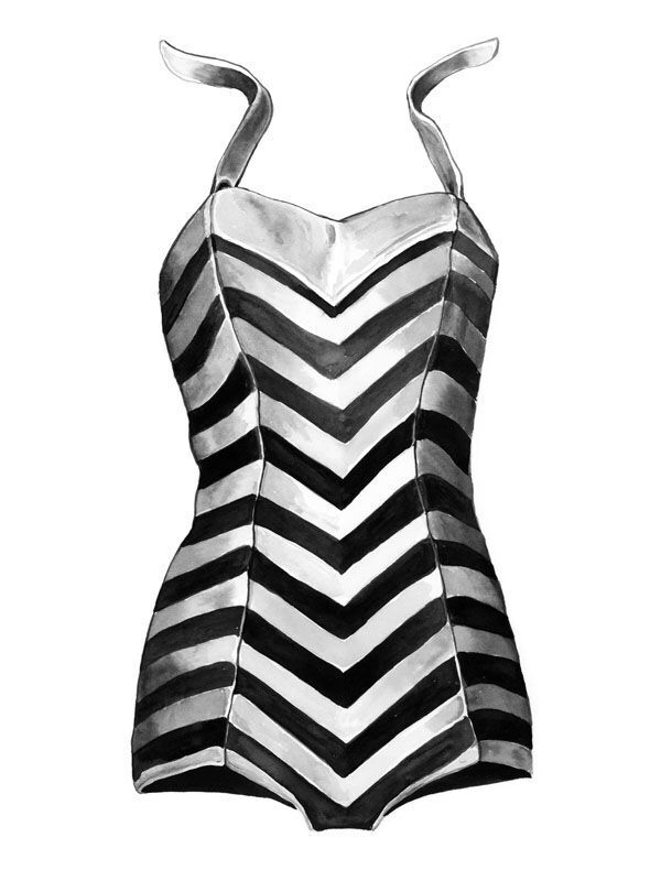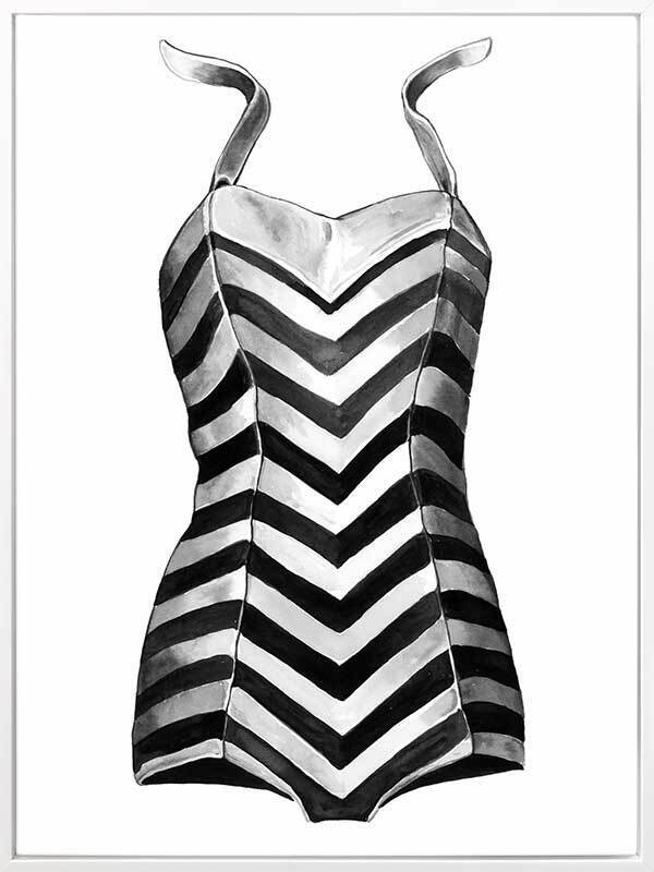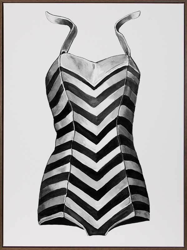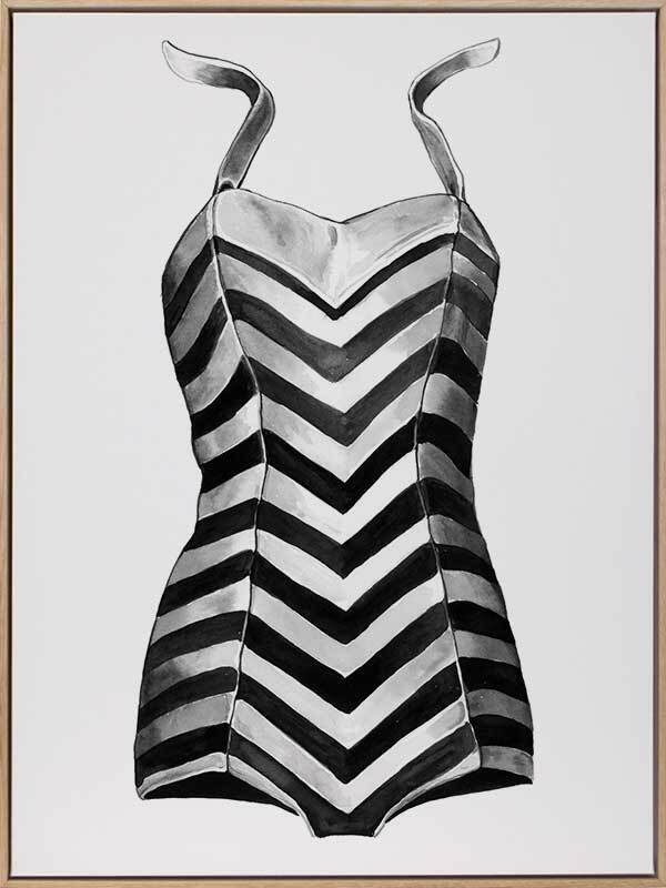 Lola Canvas Art Print: A detailed black and white watercolour illustration of a vintage inspired bathing suit. 2017 SPRING/SUMMER COLLECTION: RHAPSODY