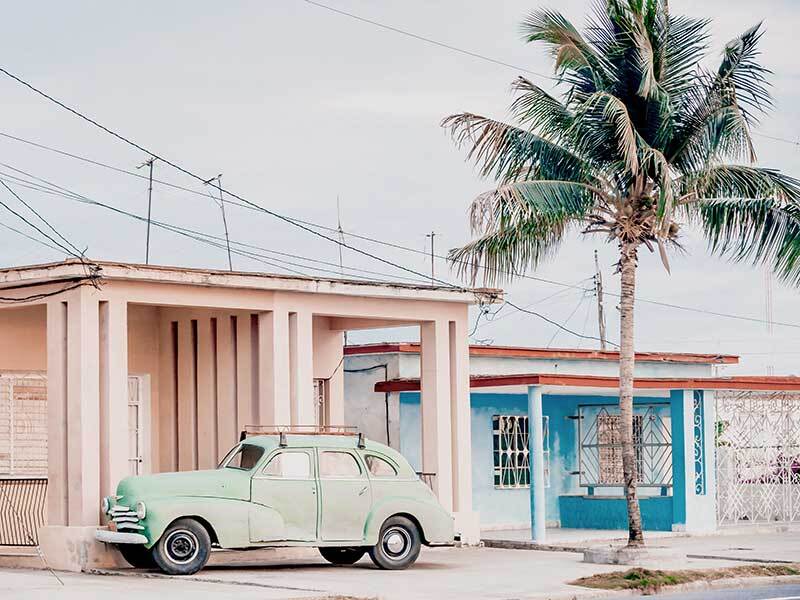 Pastel La Palma - A playful, vintage inspired photographic print that features a classic mint green beach wagon parked outside pastel coloured buildings in South America.