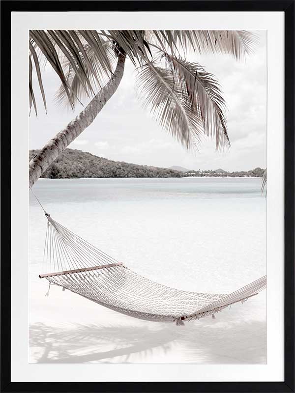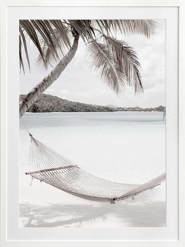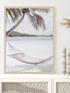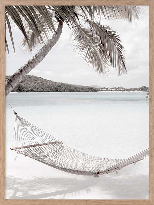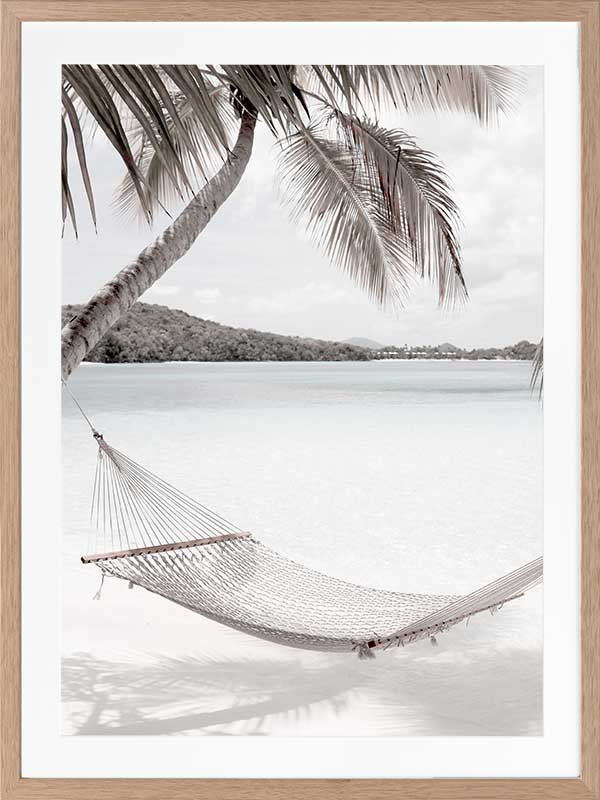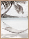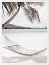 Rest Easy - Kick back and relax in a tropical oasis with this photographic print, featuring a hammock hung between two palm trees, overlooking a beautiful bay.