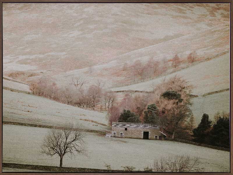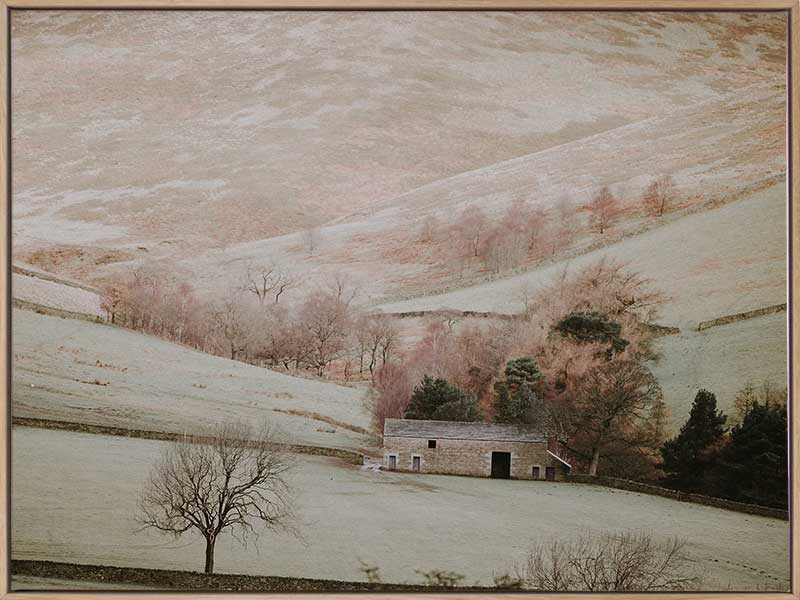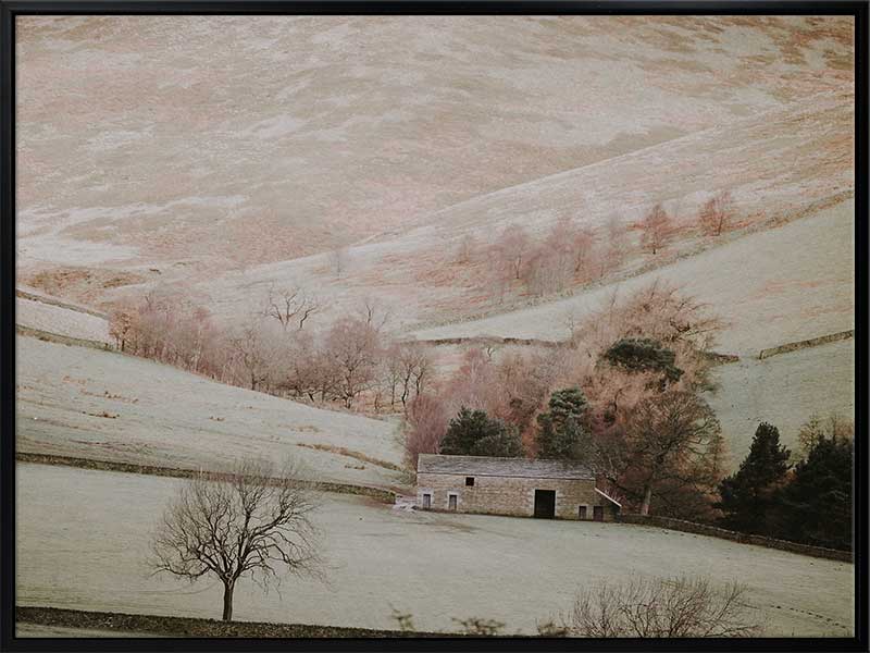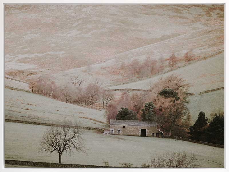 Sleepy Hollow - A photographic image featuring a quaint countryside cottage in a field of blush coloured trees.