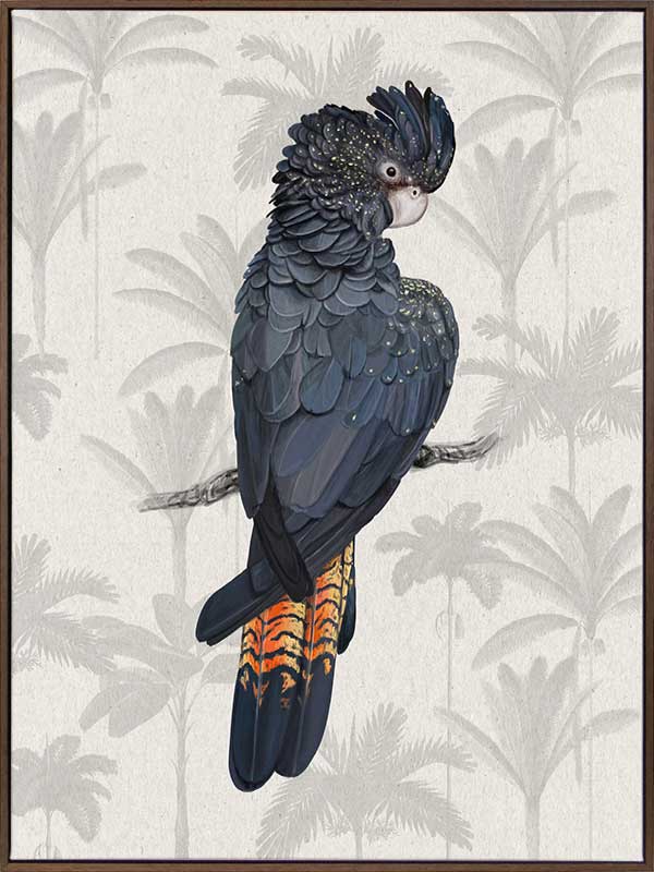 Tropical Cockatoo - An incredibly detailed Black Cockatoo sits against a tropical palm tree motif.