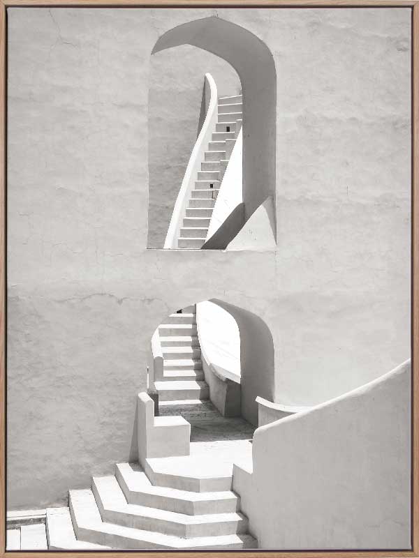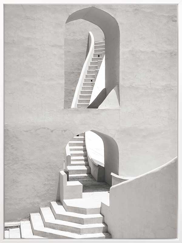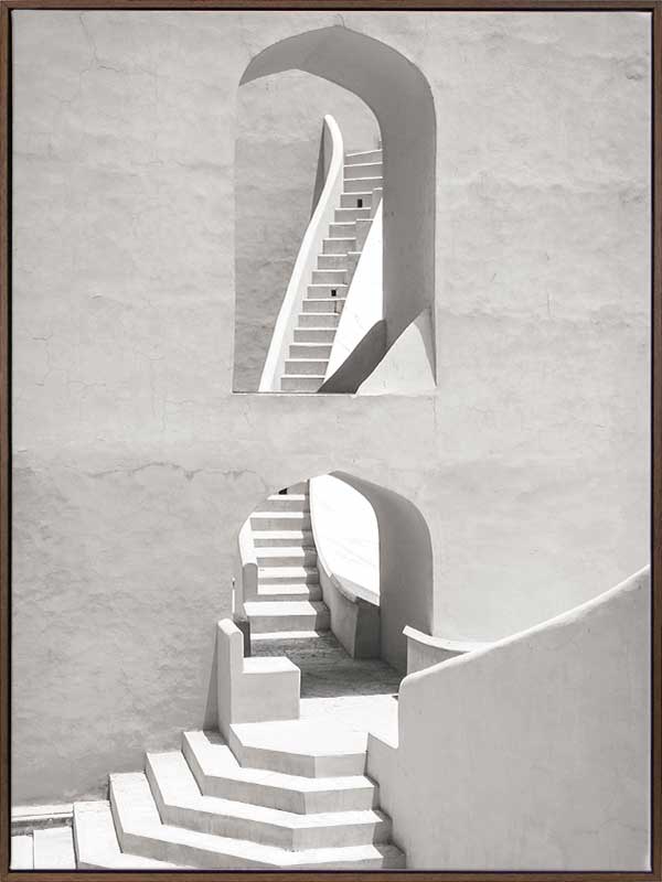 Winding Staircase Grey - Celebrate the wonder and whimsy of architecure with this photograph featuring spiralling staircases moving through grand archways in a light grey colour palette.