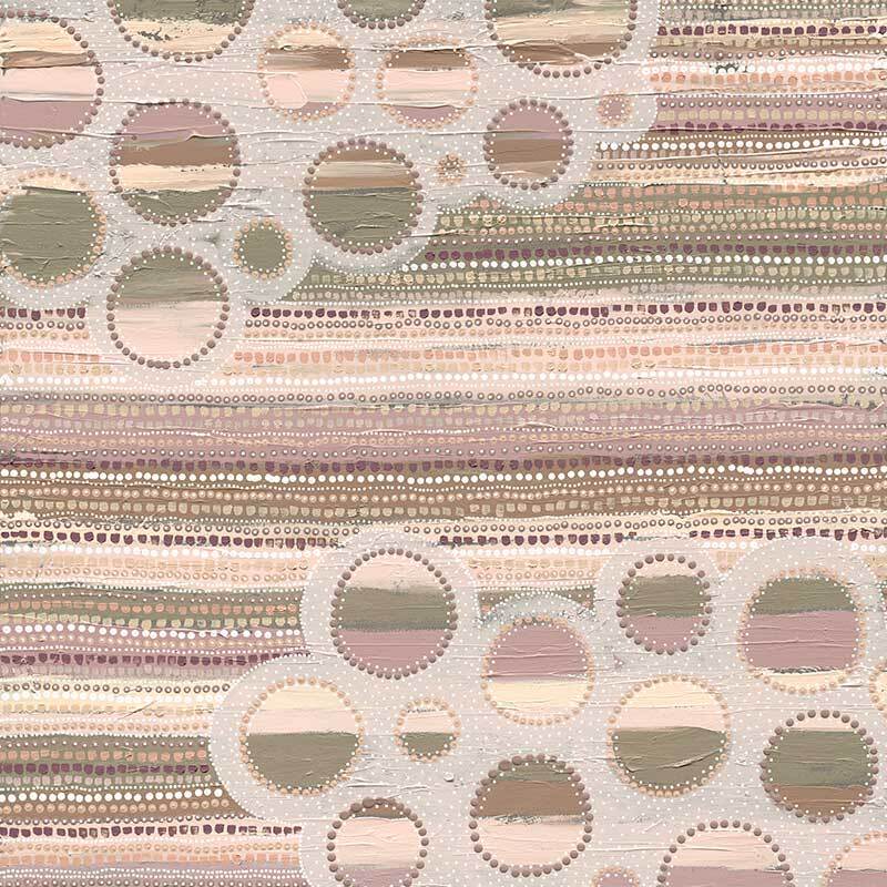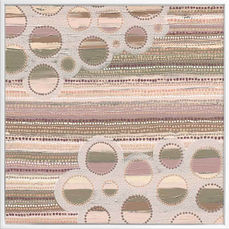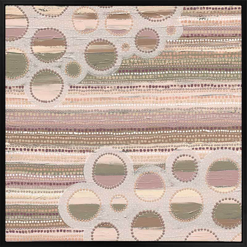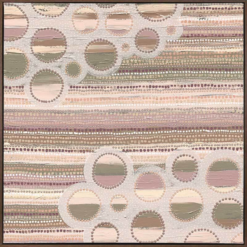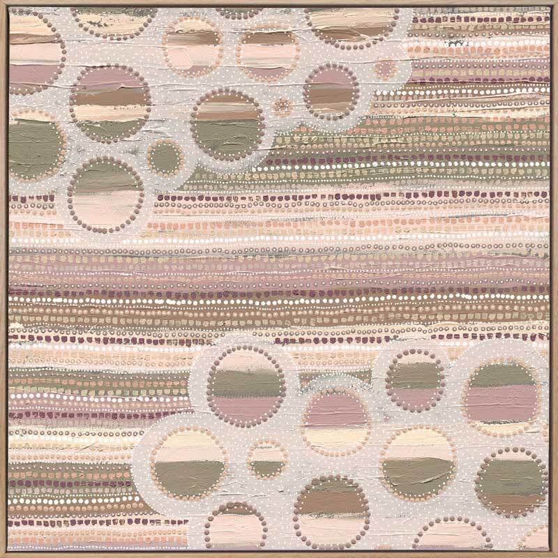Wiradyuri Yiramiilan Purple Canvas Art Print - With a distinctive, muted colour palette of pink and purple undertones, this Indigenous Aboriginal artwork uses traditional dot painting for a uniform look and feel. Horizontal lines are broken up by lighter coloured holes, giving an effect of movement, like clouds passing through a rainy sky. A versatile piece for any room.