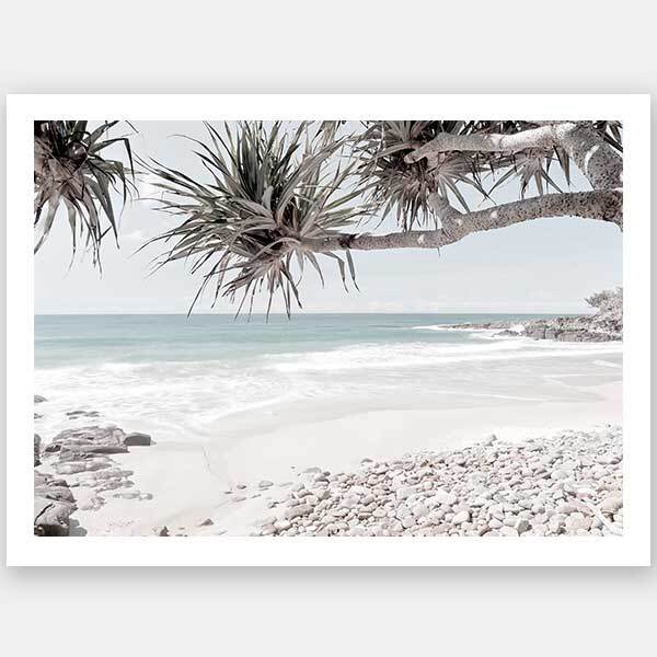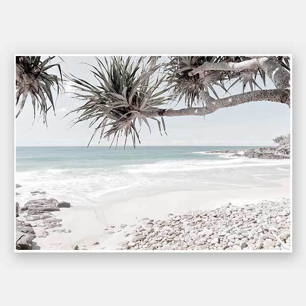Wouldn't it be Nice - Coastal beauty comes to life in this desaturated photographic artwork, featuring a wide, rocky ocean shore line framed by pandanus trees.