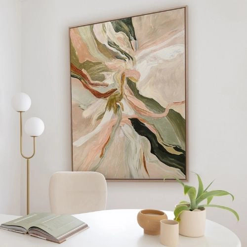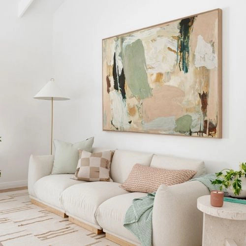 From minimalist lines to bold abstracts, large wall artwork spans a wide range of styles. Large modern artwork is especially popular, as well as large Aboriginal artwork that brings cultural storytelling into focus. Whether framed or unframed, these pieces often showcase thoughtful texture, rich colour, and expressive detail.