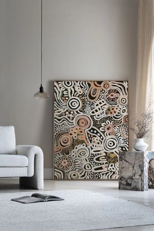 From minimalist lines to bold abstracts, large wall artwork spans a wide range of styles. Large modern artwork is especially popular, as well as large Aboriginal artwork that brings cultural storytelling into focus. Whether framed or unframed, these pieces often showcase thoughtful texture, rich colour, and expressive detail.