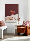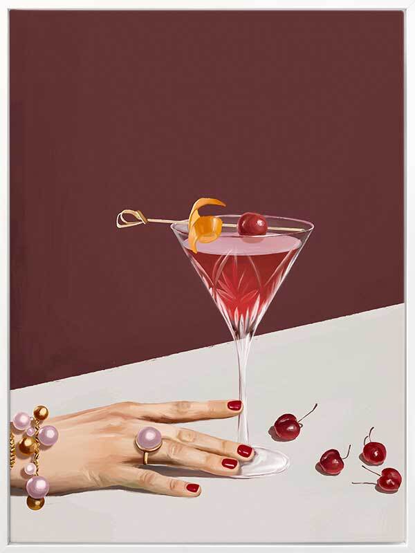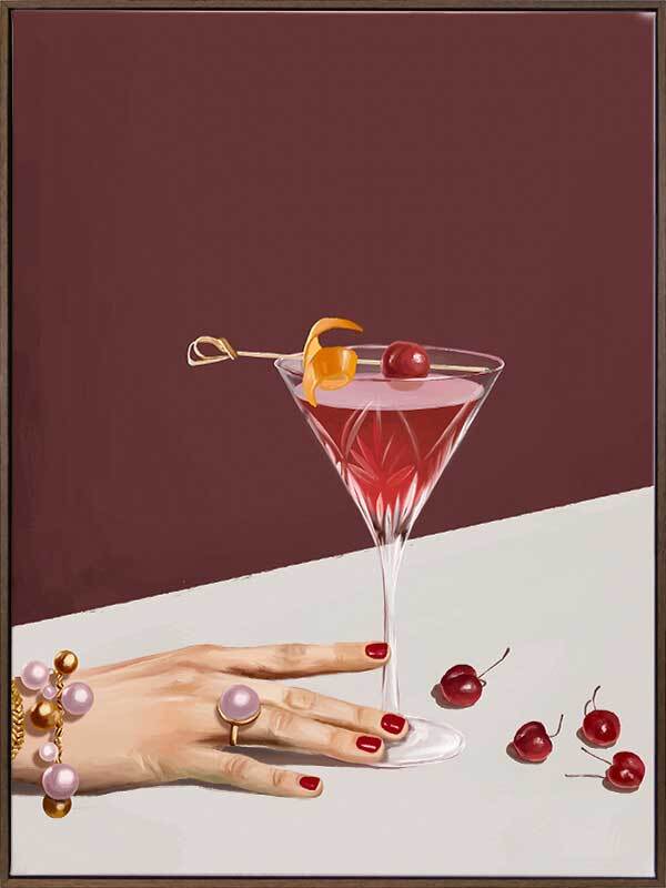A Cosmopolitan Canvas Art Print - As the French say, santé! Bring an elegant sophistication to your space with this soft and glamorous modern art print, featuring a A Cosmopolitan in a luxurious crystal glass, with orange peels, cherries, and a woman's gorgeous purple and gold ring and bracelet on display. Perfect for a kitchen or lounge area, this piece has a simple palette of burgundy, dark pink, and lilac.