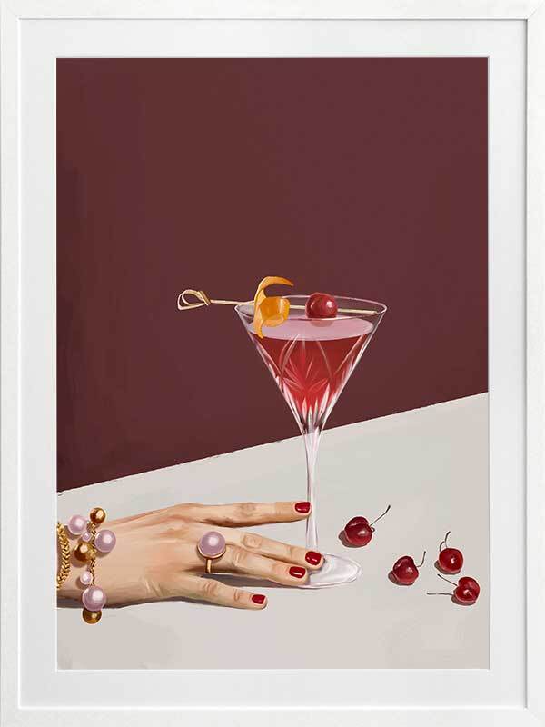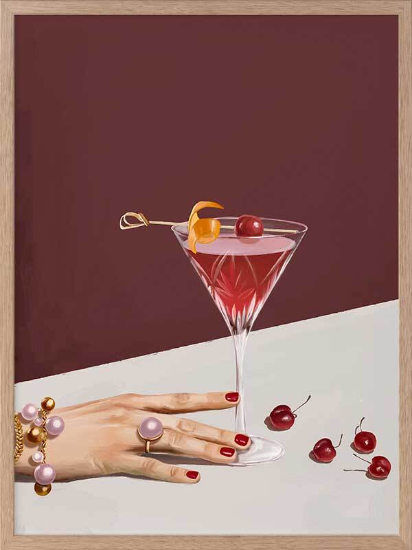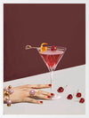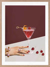A Cosmopolitan Framed Art Print - As the French say, santé! Bring an elegant sophistication to your space with this soft and glamorous modern art print, featuring a A Cosmopolitan in a luxurious crystal glass, with orange peels, cherries, and a woman's gorgeous purple and gold ring and bracelet on display. Perfect for a kitchen or lounge area, this piece has a simple palette of burgundy, dark pink, and lilac.