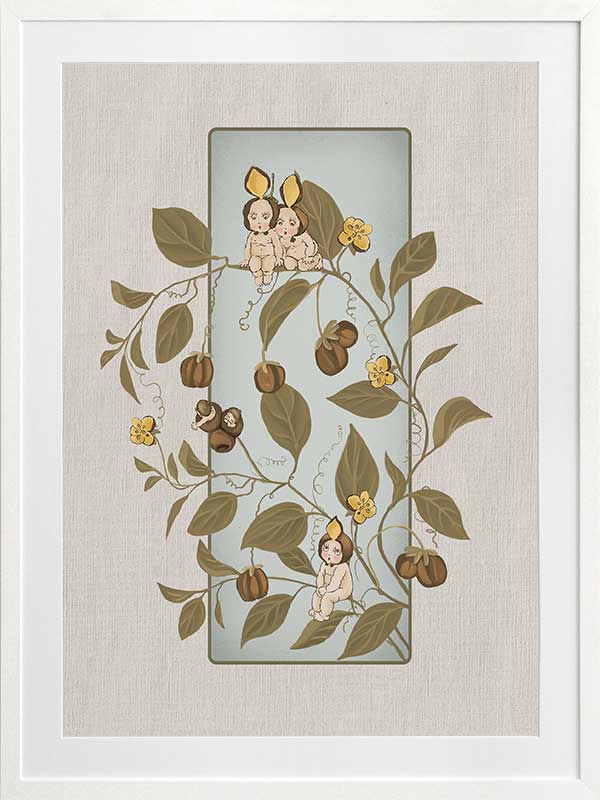 A Day with the Boronia Babies Grey Framed Art Print - Step into a serene bushland dream with this artwork featuring the ever-curious Boronia Babies. Perched playfully among delicate Boronia blooms, these sweet characters bring a sense of gentle wonder to your walls.
