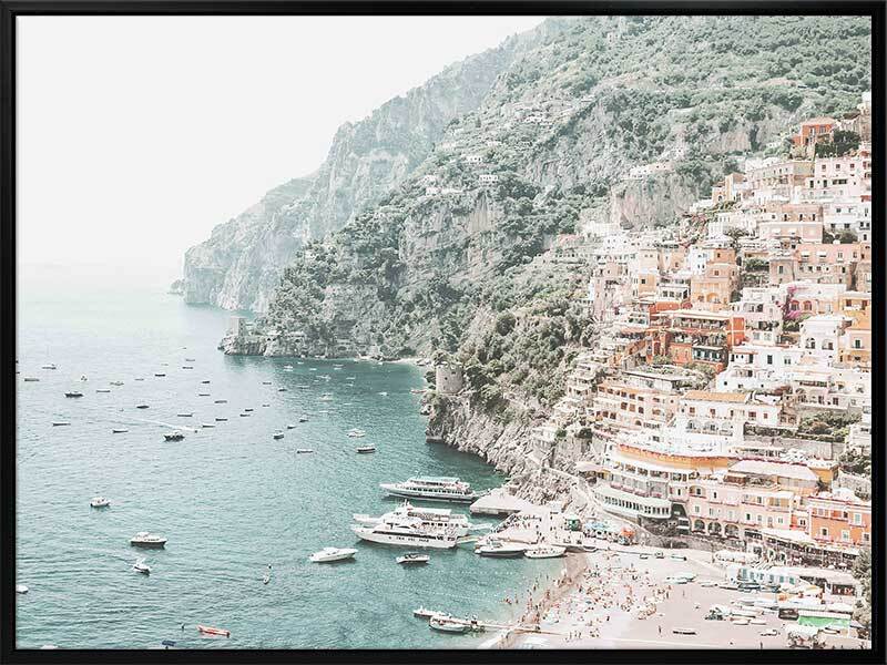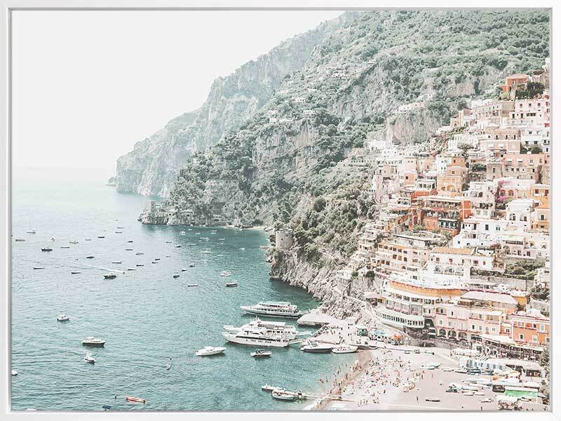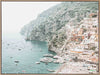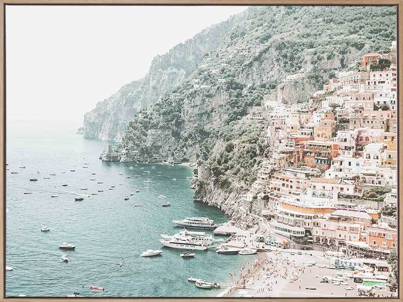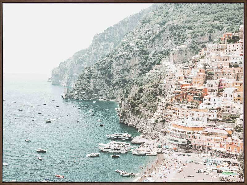 A European Holiday Canvas Art Print - There's nothing quite like the beauty of a summer holiday in Europe, which this photographic art print captures so perfectly with a coastal town. The muted palette of neutrals, oranges, greens, and blues makes it versatile for any space, and perfect for travel photography lovers and vintage vibe fans.