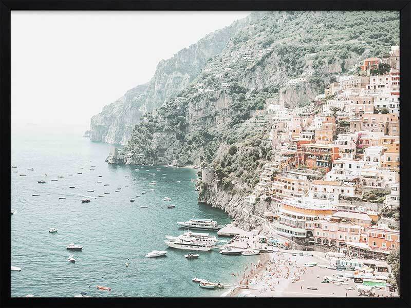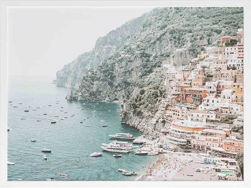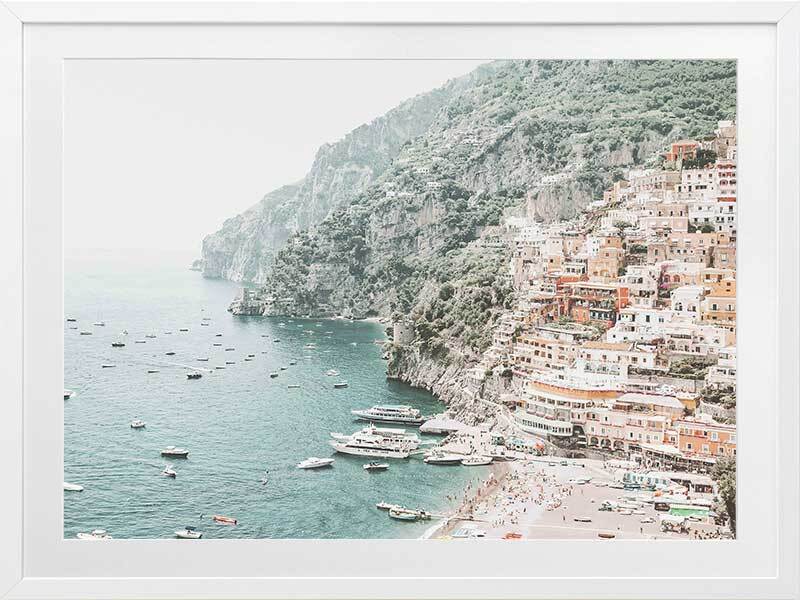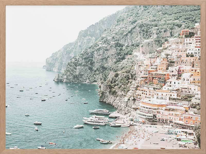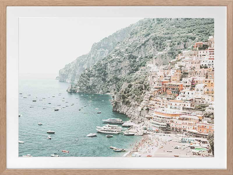A European Holiday Framed Art Print - There's nothing quite like the beauty of a summer holiday in Europe, which this photographic art print captures so perfectly with a coastal town. The muted palette of neutrals, oranges, greens, and blues makes it versatile for any space, and perfect for travel photography lovers and vintage vibe fans.