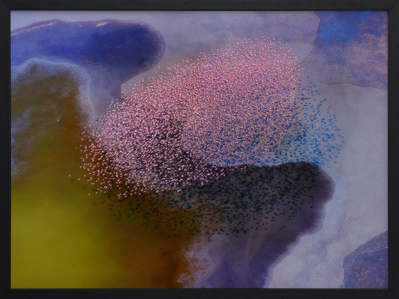 A Flamboyance Framed Art Print - A stunning photographic artwork featuring a flock of flamingos flying above a large chartreuse and purple lake. THE CURATED SERIES A handpicked gallery of daringly quirky photographic pieces exploding with richness of colour and texture.