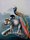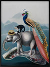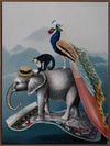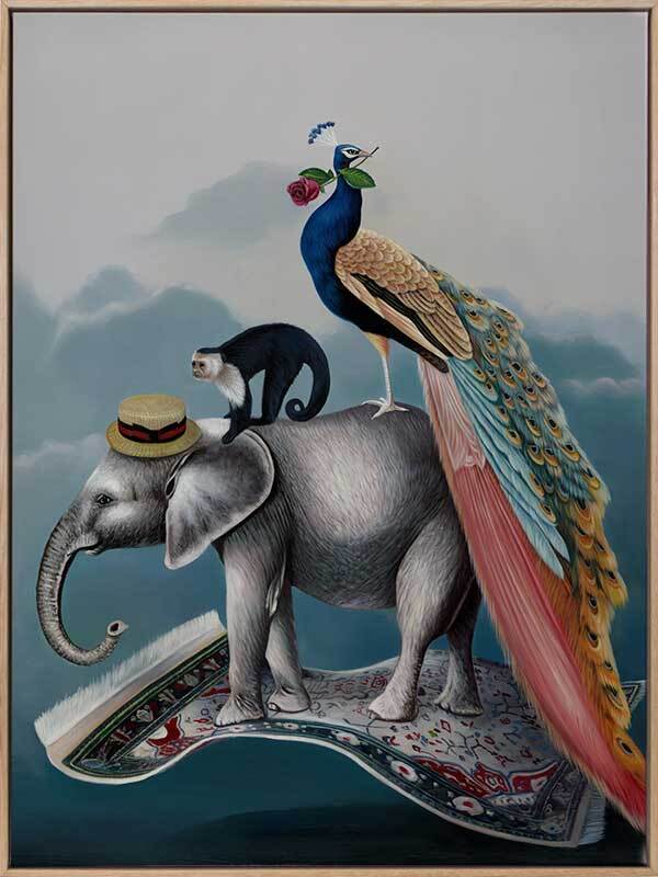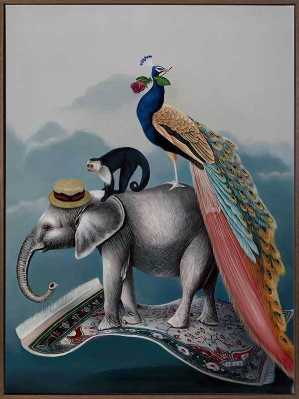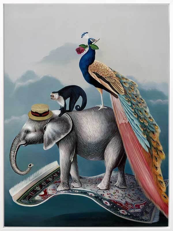 A Grand Adventure Canvas Art Print: A whimsical art print that features a magic carpet-riding trio - Cecil the Elephant, Martin the Monkey, and Fabrizio the Peacock. This beautifully detailed artwork is a part of a trio, made to match with our Wonderland and The Coronation prints. 2019 AUTUMN/WINTER COLLECTION: ODYSSEY