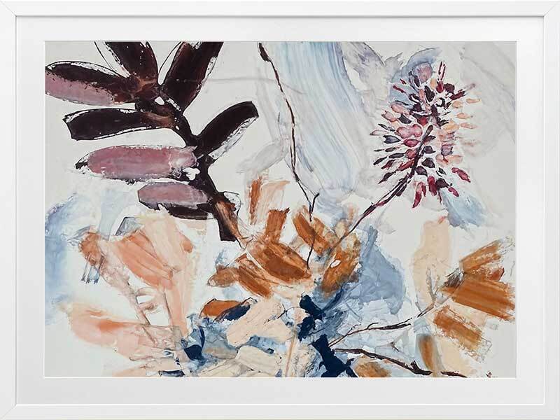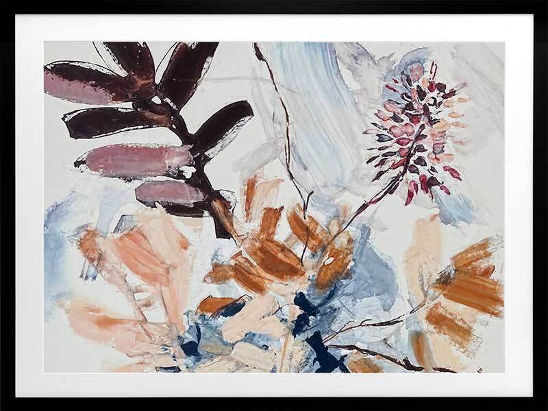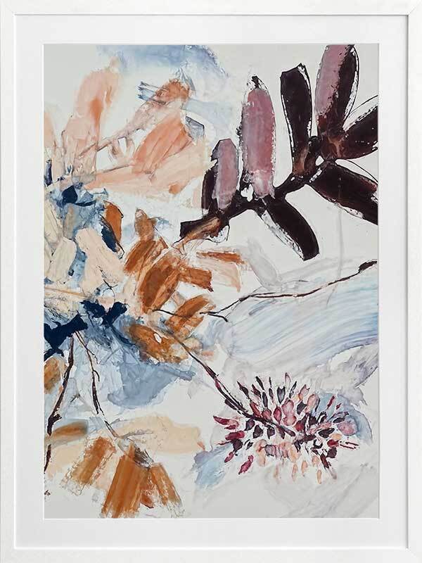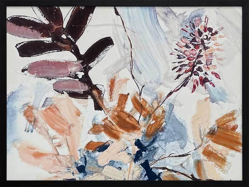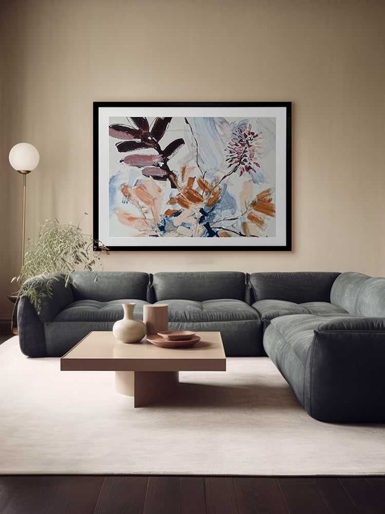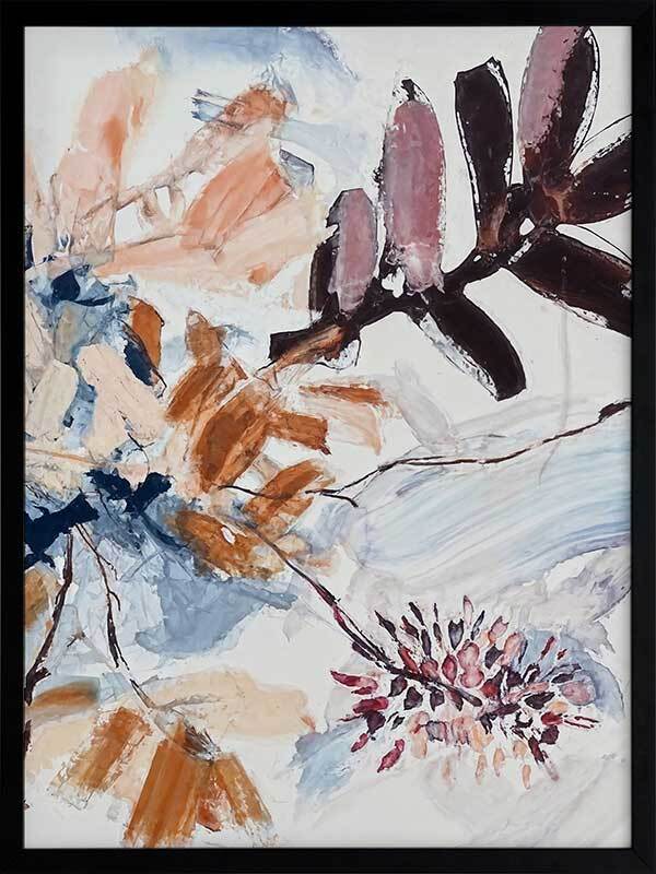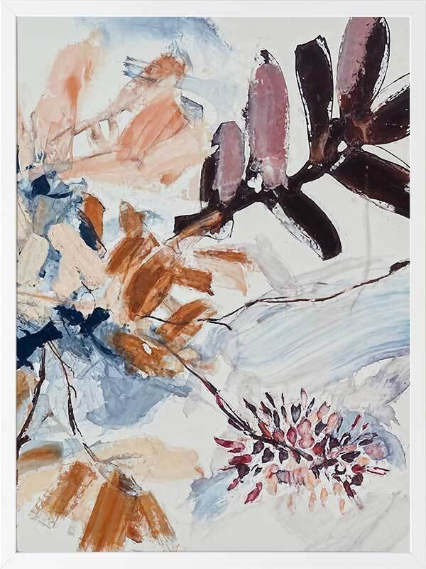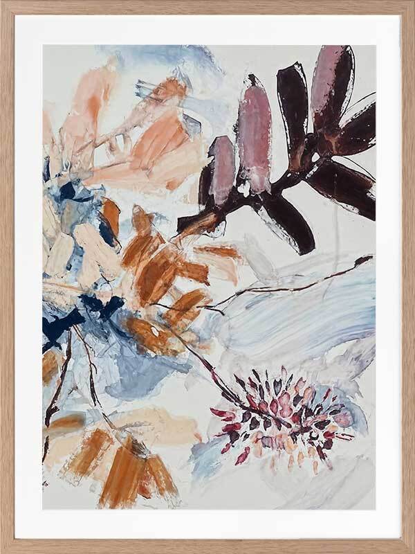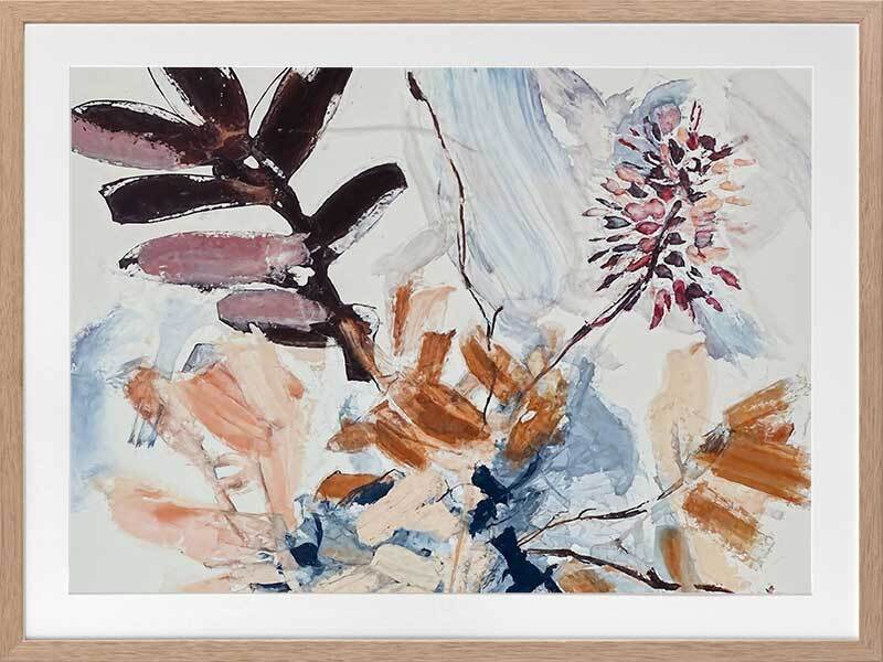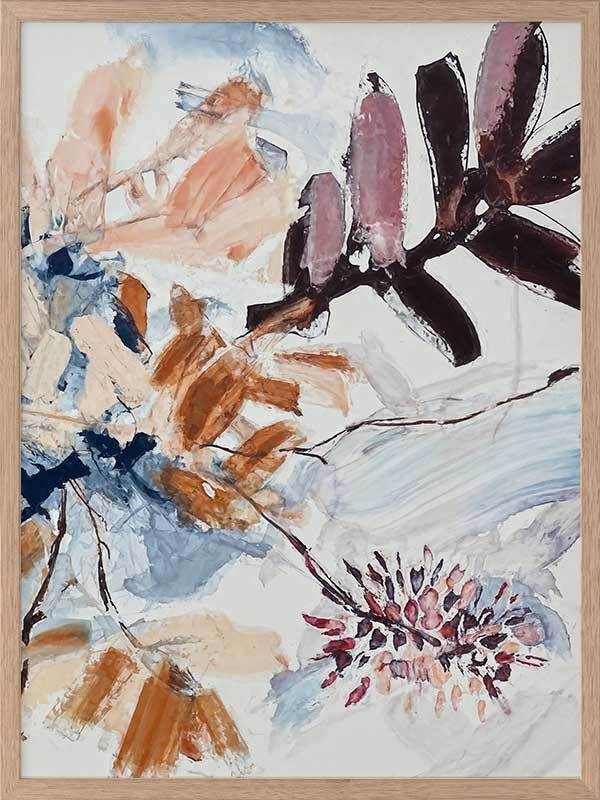 A Leafy Endeavour II Framed Art Print - Inspired by abstract line work, this floral artwork is the perfect way to bring warmth to your space as each line and brush stroke carefully flows across the canvas. Petals and branches bounce in the wind, with blue, peach, purple, and warm brown shades adding a calmness to any space. Pair with A Leafy Endeavour I and III.