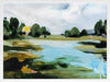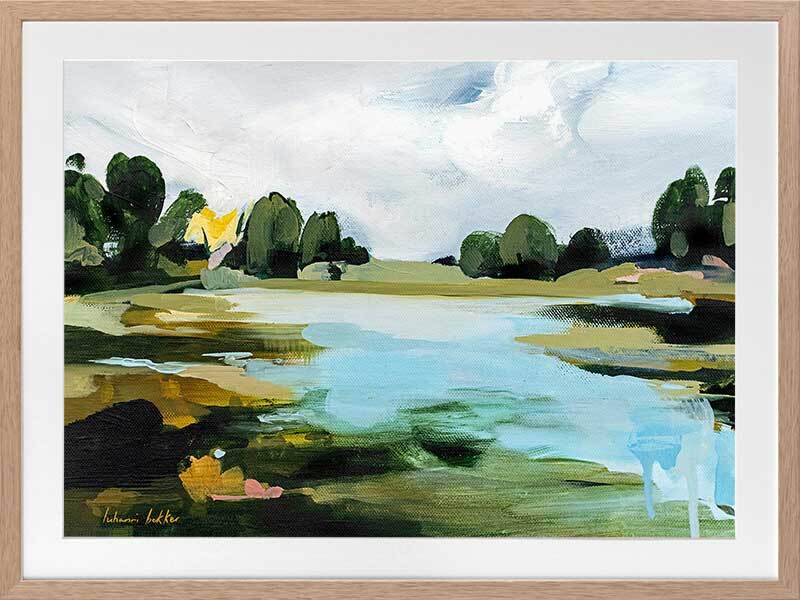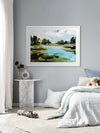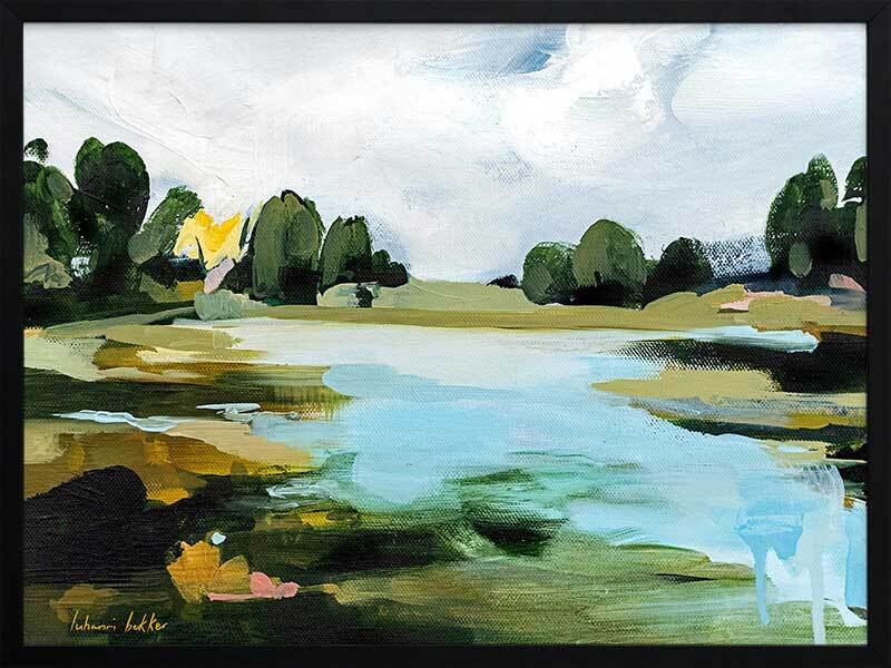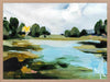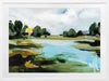 A Touch of Sunlight Framed Art Print - This scenic beauty brings a hidden lake to life, surrounded by tall trees, dewy grass, and a few hidden lily pads. Painterly brush strokes are complemented by soft tones of blue, with dark and light green shades that make the whole piece pop, bringing any space to life.