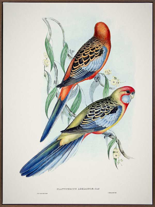Adelaide Rosella - A vintage nature illustration of a pair of Adelaide Rosellas on a neutral background.