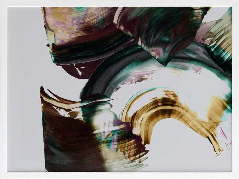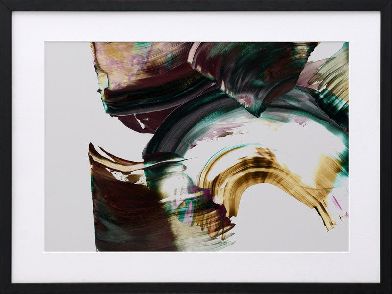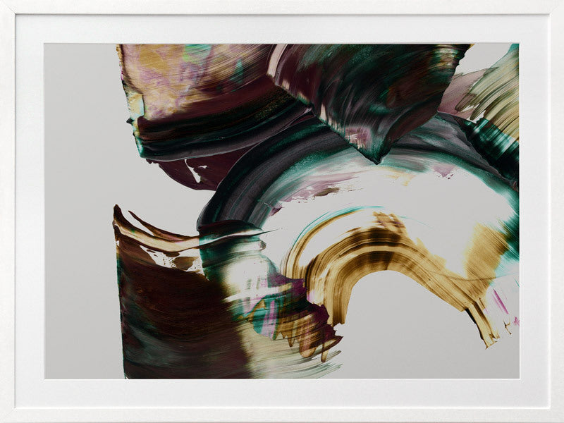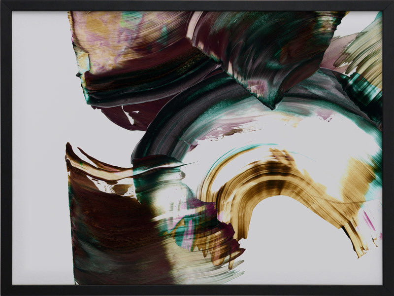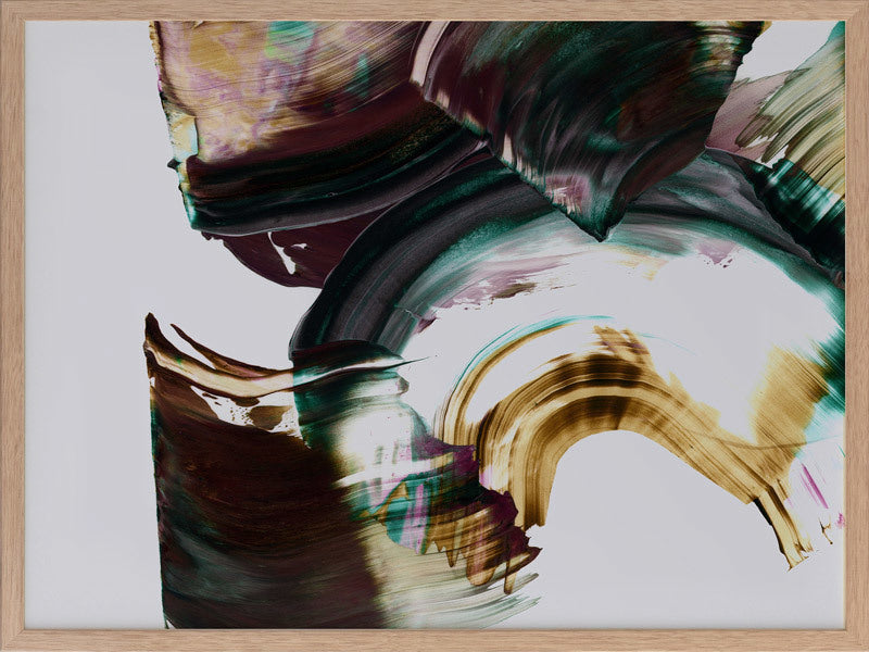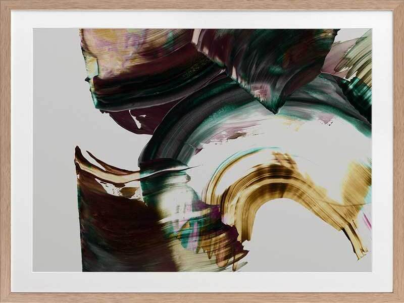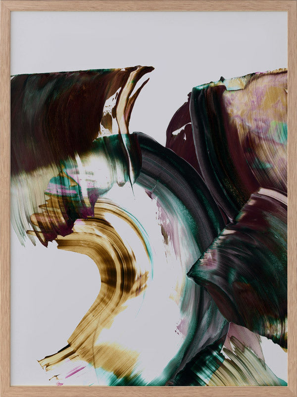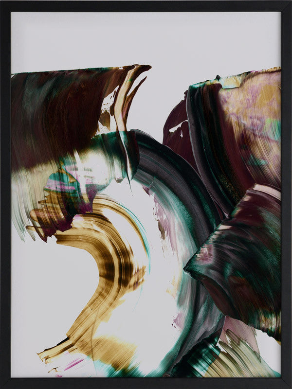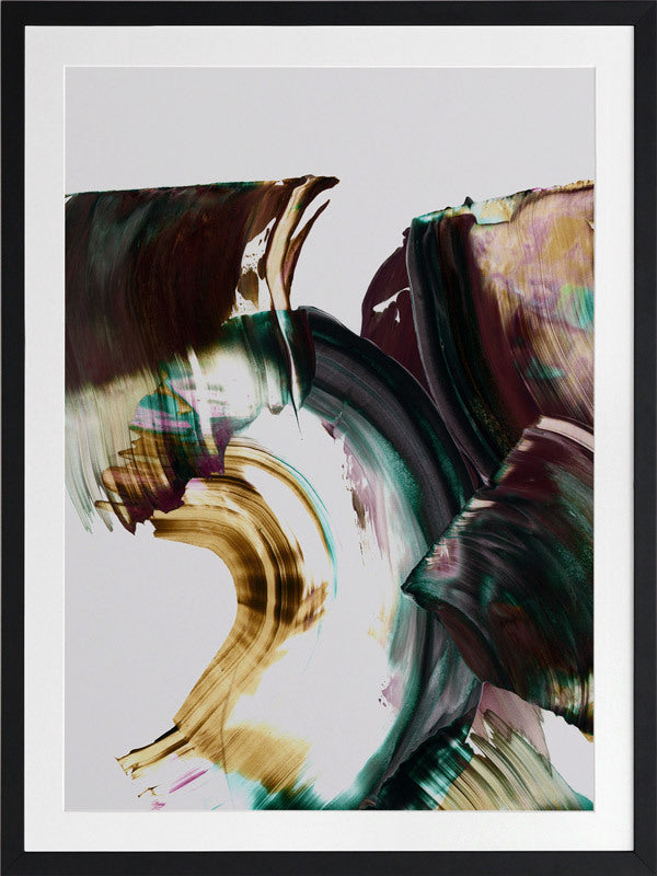 Adina Framed Print: An abstract artwork featuring broad, squeegee strokes in a dark, muted purple, teal and mustard colour palette. Pairs with Tallevera. 2019 AUTUMN/WINTER COLLECTION: ODYSSEY