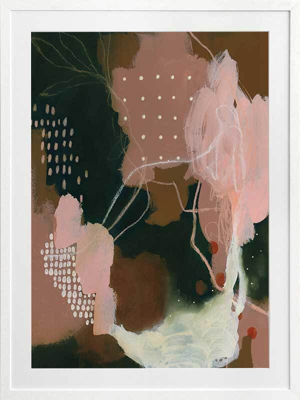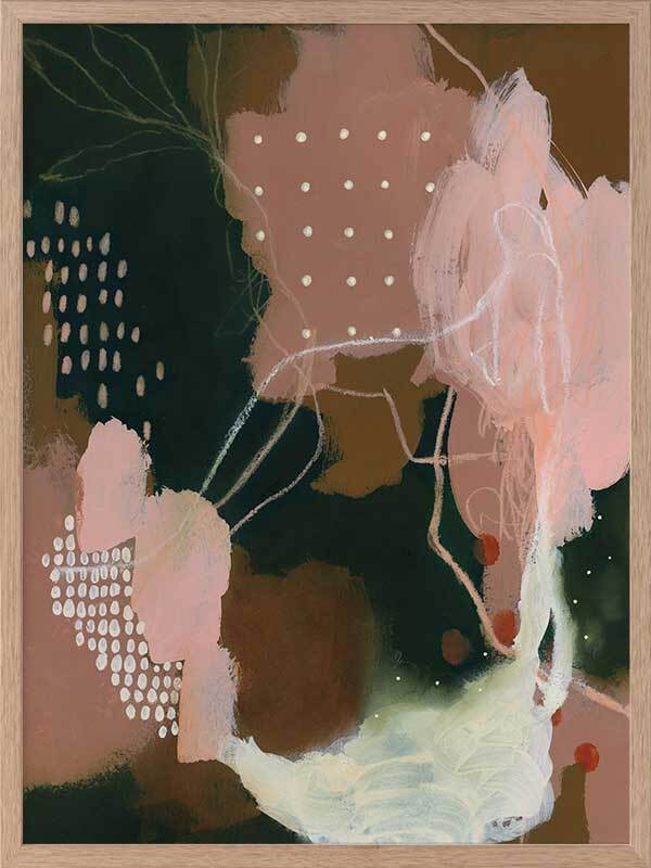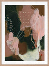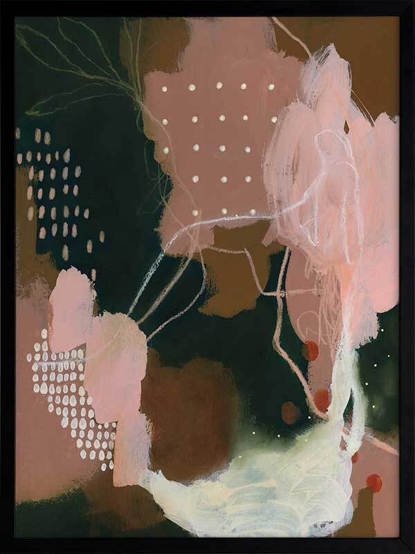Adventurous III Framed Art Print - A beautiful contrast between a deep phthalo green colour with blush pink tones in the foreground, with a unique blend of dots, lines and dry brush strokes, and a light green shade in the lower right corner that gives it a glowing effect. Perfect for deepening the tones in your space, with some lightness added using the soft blush shades. By Artist Laura Horn.