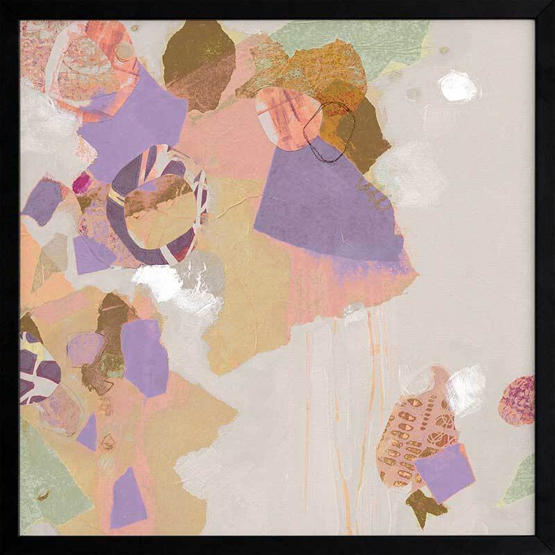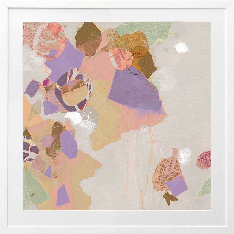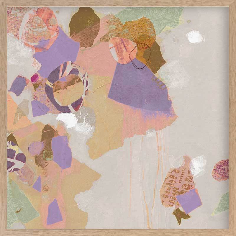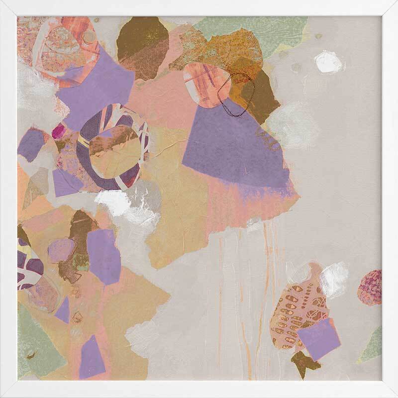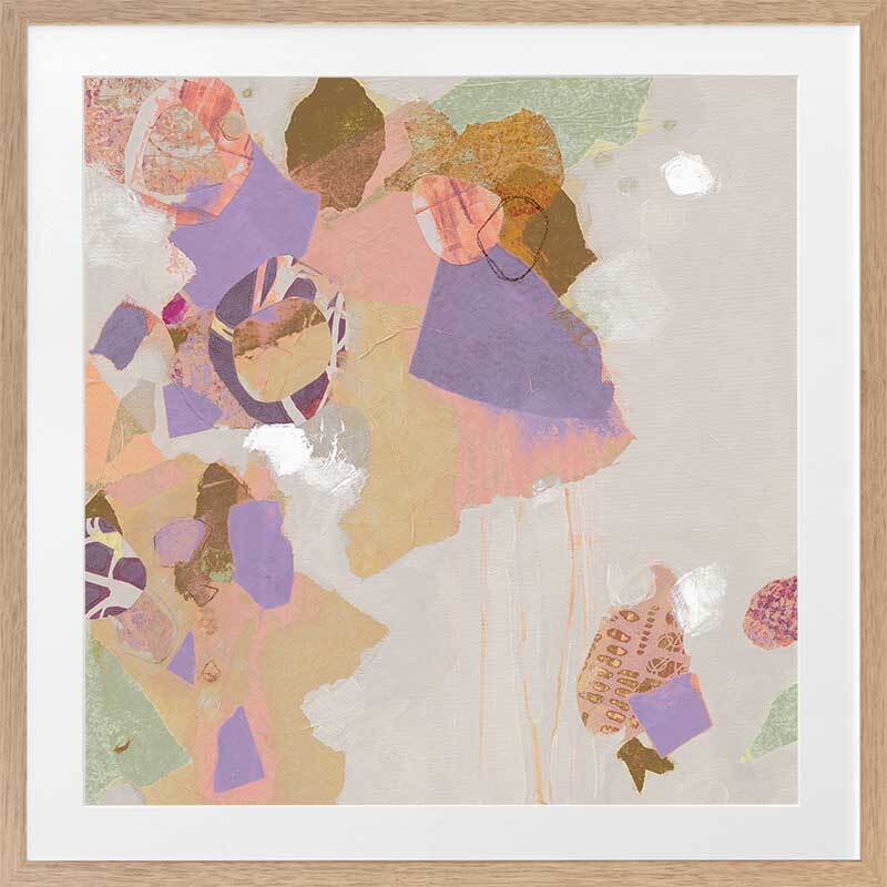 After the Rain Framed Art Print - Looking at the positive side of life with this gorgeous collage abstract piece, featuring sporadic shapes and patterns, merging together in unity. Contrasting colours of lilac purple, soft yellow, golden brown, green, and pink give this piece a textural feel, with a light beige-grey background to match neutral tones within your space.