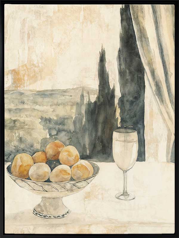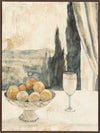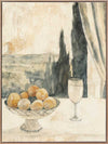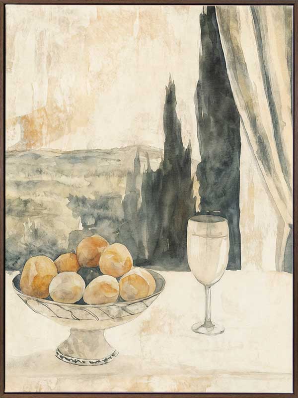 Afternoon Aperitivo Canvas Art Print - This still life artwork beautifully captures a peaceful moment of leisurely indulgence, depicted in soft watercolour tones of warm beige, ivory, and greens. This wall art print evokes tranquillity, perfect for relaxed interiors craving understated elegance and warmth. Whether adding charm to your kitchen, dining, or living space, it invites viewers to linger over life's simple pleasures.