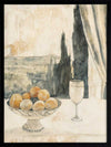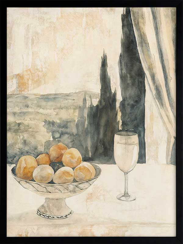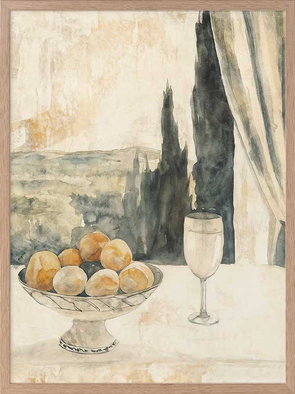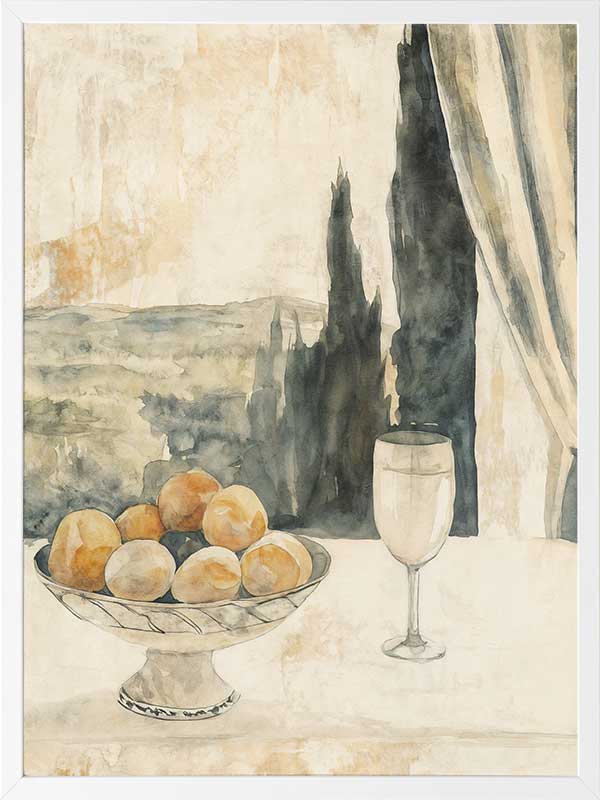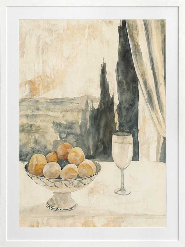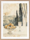 Afternoon Aperitivo Framed Art Print - This still life artwork beautifully captures a peaceful moment of leisurely indulgence, depicted in soft watercolour tones of warm beige, ivory, and greens. This wall art print evokes tranquillity, perfect for relaxed interiors craving understated elegance and warmth. Whether adding charm to your kitchen, dining, or living space, it invites viewers to linger over life's simple pleasures.