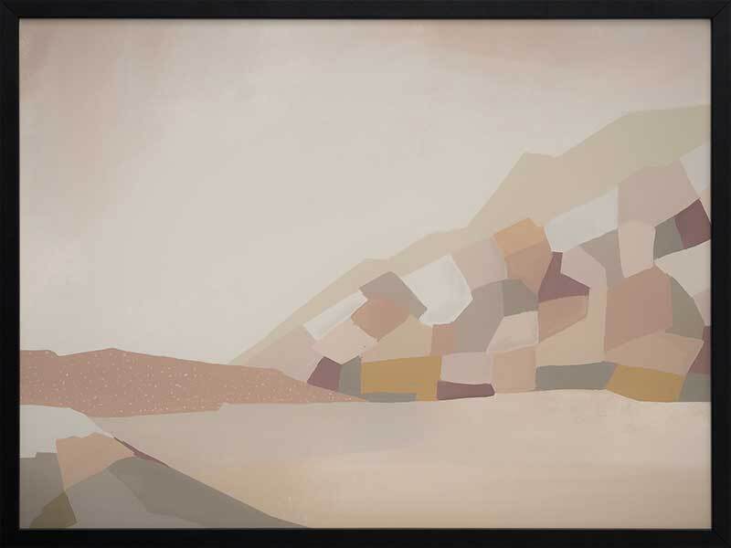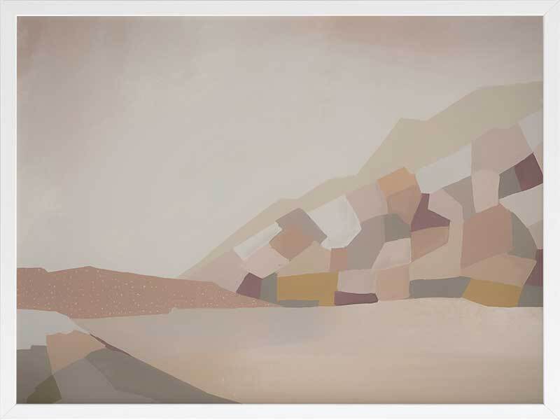 Alpine Way Framed Art Print - A muted, neutral-toned abstract landscape artwork that features blocks of colour that form a mountain like structure.