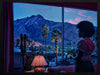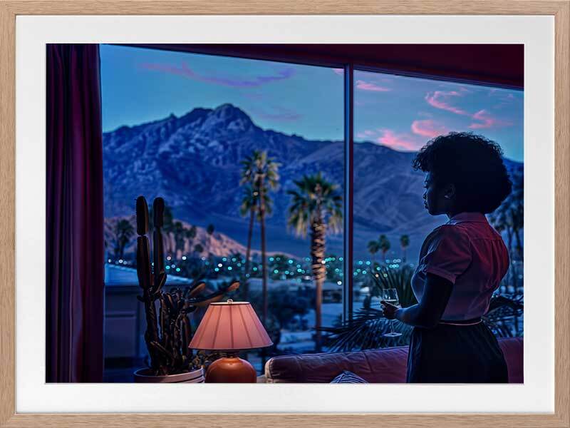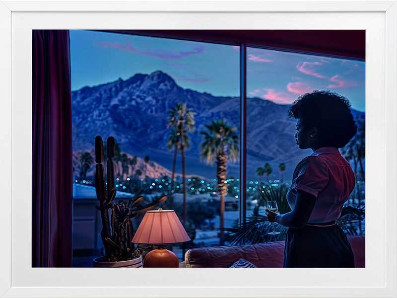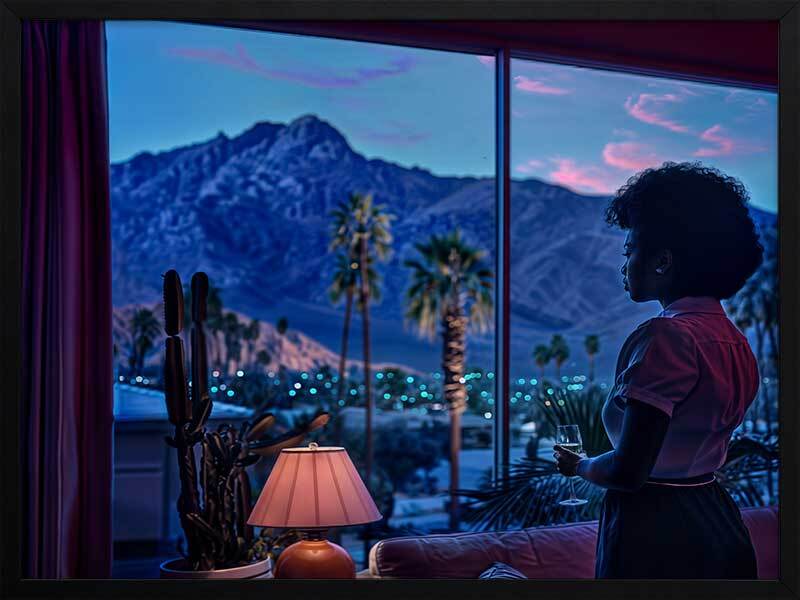 An Evening in Palm Springs Framed Art Print - This captivating photographic artwork showcases a serene evening in Palm Springs, with a woman gazing out at a mountain landscape framed by palm trees. The vibrant hues of twilight blues and purples set a dreamy, contemplative mood. Ideal for adding a touch of elegance to your living room or bedroom, this retro wall art brings the tranquillity and beauty of the 20th century into your space.