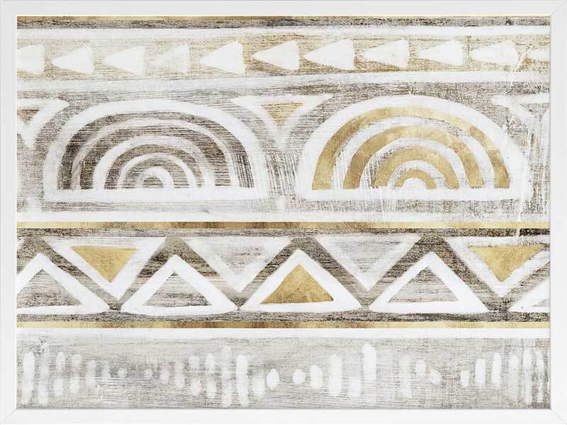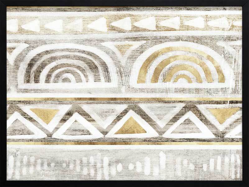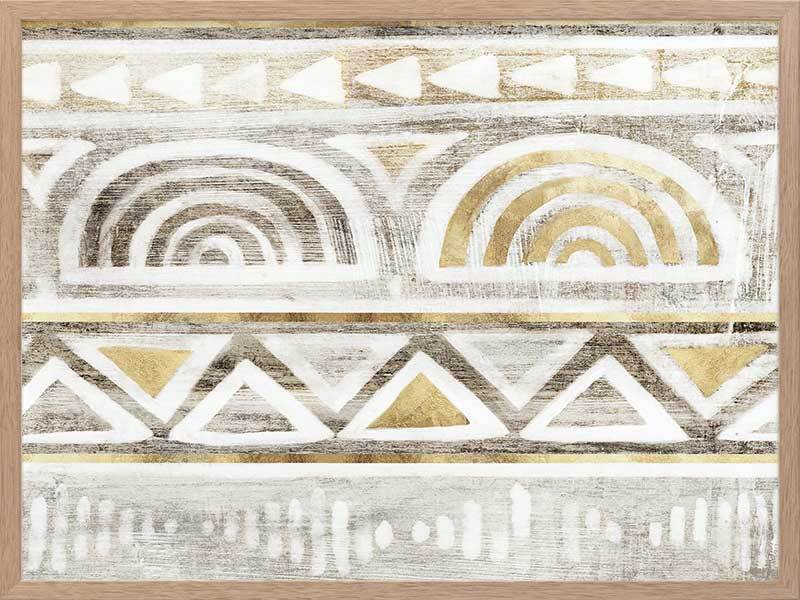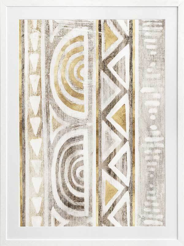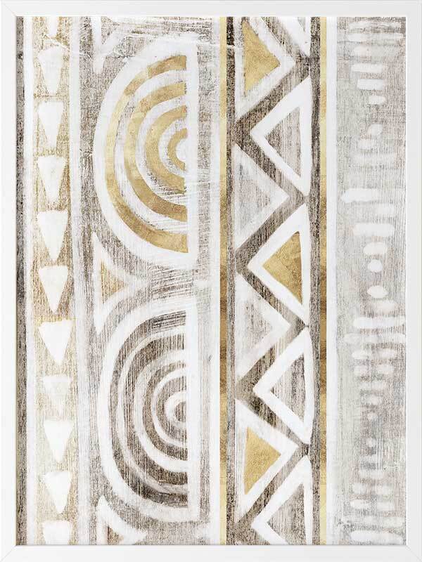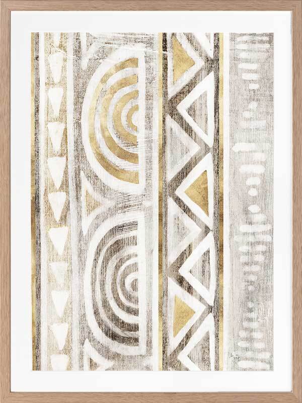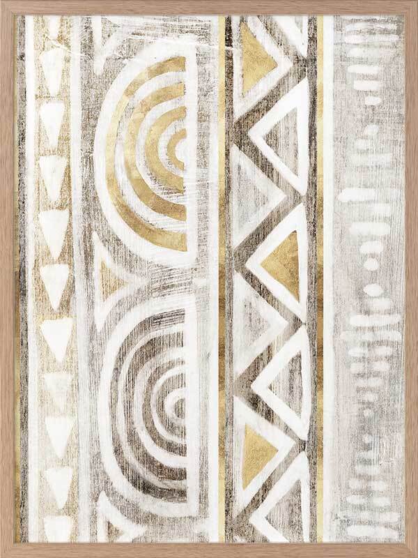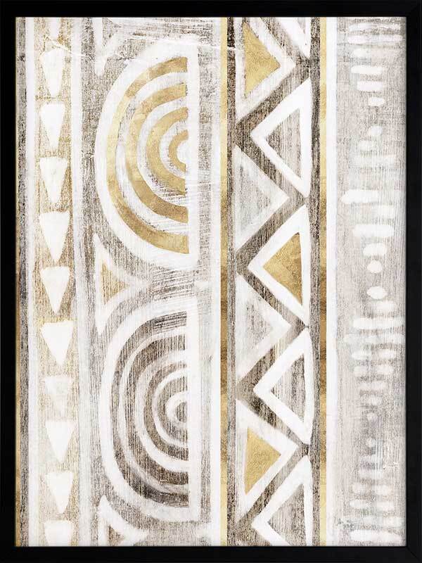 Ancient Treasure II Framed Art Print - Transform your space with the symmetrical shapes and repetitive patterns of this Aztec-inspired abstract piece. Gold accents bring a refined feel to this artwork, with a painterly quality and monotone grey and beige colours that suit many interior design styles.