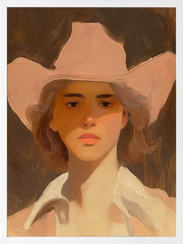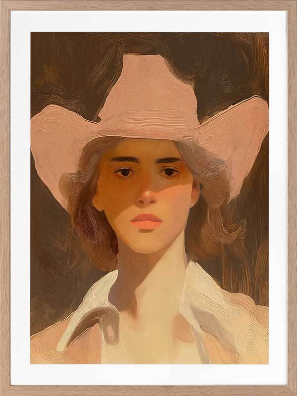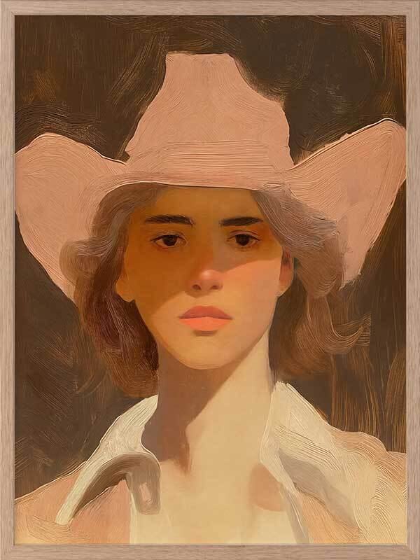 Annie's Dusty Ride Framed Art Print - Soft, flowy, and dreamy, this country-themed artwork of a contemplative Annie wearing her favourite cowboy hat is a breathtaking piece to add a calm moodiness to any space. A soothing palette of dusky pinks, muted browns, and gentle creams works harmoniously with smooth, sweeping brush strokes for a painterly look.