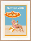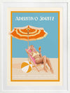 Aperitivo Spritz Poster - A vibrant yet simplistic fashion style illustration featuring a women with a swim suit on the beach sipping a cocktail. The colour pallet is consists of both warm and cool tones featuring white, orange and blue.