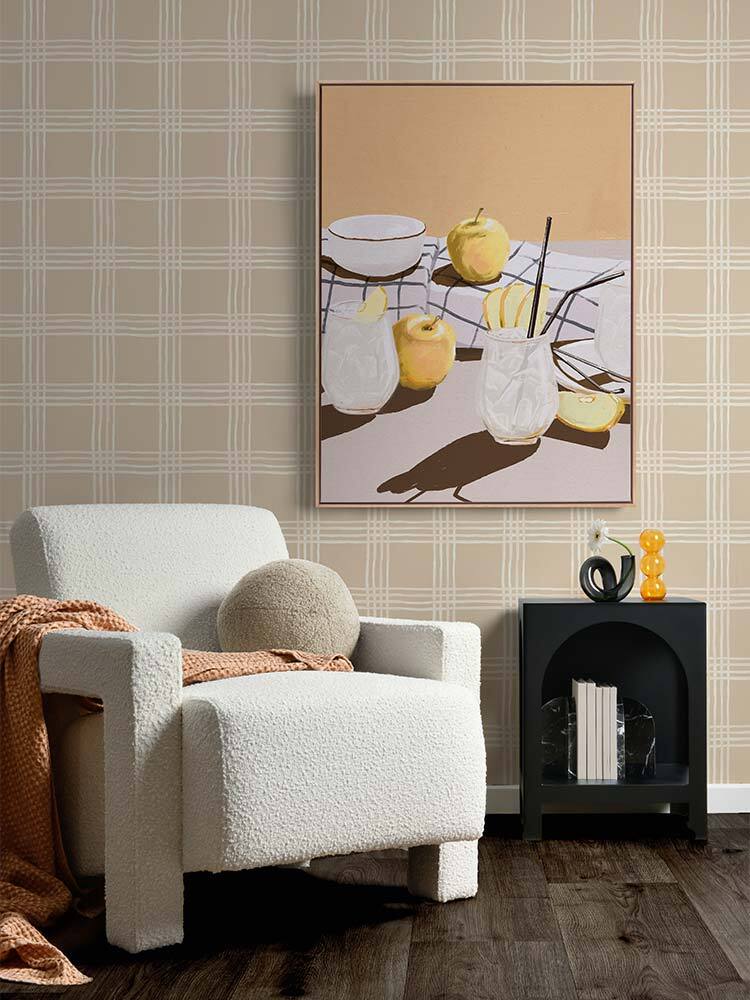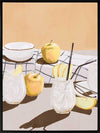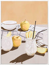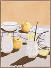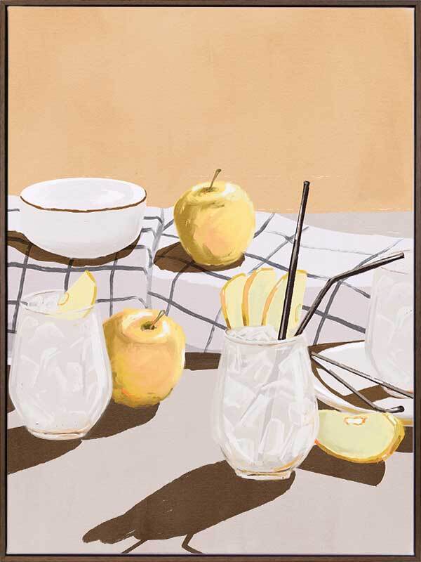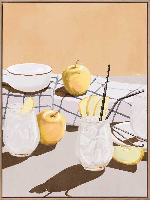 Apple Juice Canvas Art Print - Quench that summer thirst with a cold glass of freshly squeezed apple juice. Bring some summer energy to your space with this gorgeous piece, capturing a moment in time on a busy outdoor dining table with fresh apples, a few tall drinks, and the favourite tablecloth lying underneath the morning sun. A colour palette of soft yellow, beige, white and grey complement any interior design style.