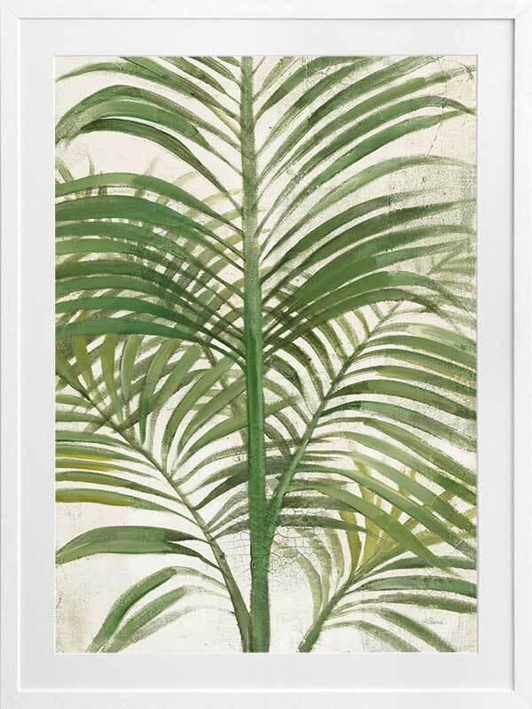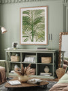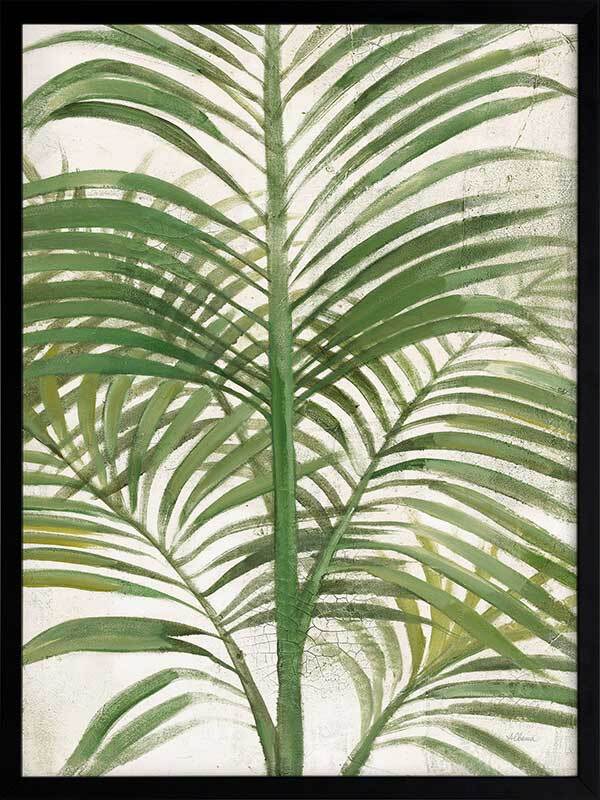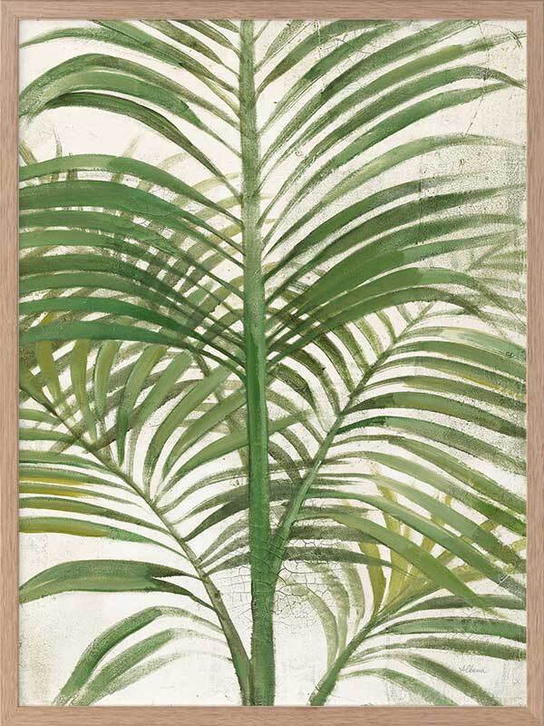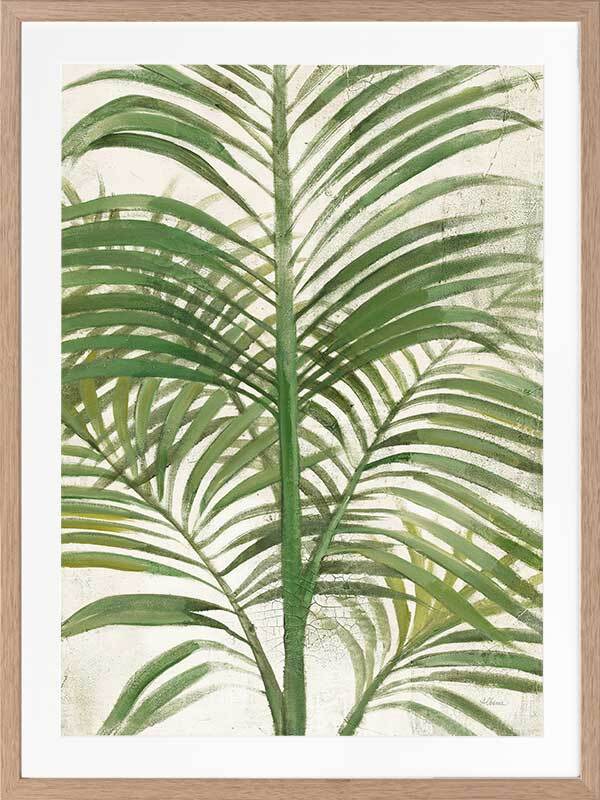 Areca Palm II Framed Art Print - A wonderfully organic artwork that features a close cropped vignette of overlaid warm, khaki and olive green palm fronds against a golden beige background. Pairs with Areca Palm I.